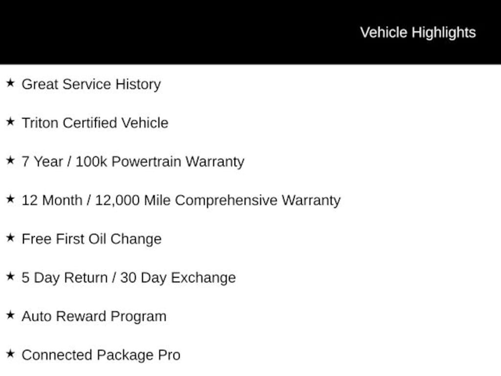 Certified. Certification Program Details: Triton Certified Shield ⢠7-Year or up to 100,000-Mile Powertrain Limited Warranty ⢠12-Month or 12,000-Mile Comprehensive Coverage ($100 deductible) ⢠100+ Multipoint Inspection ⢠All Fluids Checked ⢠Tires 6/32" or Better ⢠50% or Better brakes ⢠Oil, Lube, & Filter Service Completed ⢠PA State Inspection & Emissions Test ⢠5-Day Return Policy1 ⢠30-Day Exchange Policy2 ⢠CARFAXTM Report ⢠AutoRewards Membership ⢠See salesperson for additional offers & complete details.