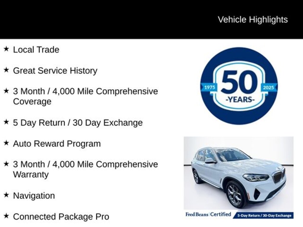 This 2022 BMW X3 xDrive30i has been meticulously maintained, with a great service history and low mileage of just 51,304. It's a Triton Certified Classic Vehicle, meaning it has undergone a rigorous inspection and comes with a comprehensive 3-month/4,000-mile warranty, giving you peace of mind and confidence in your purchase.