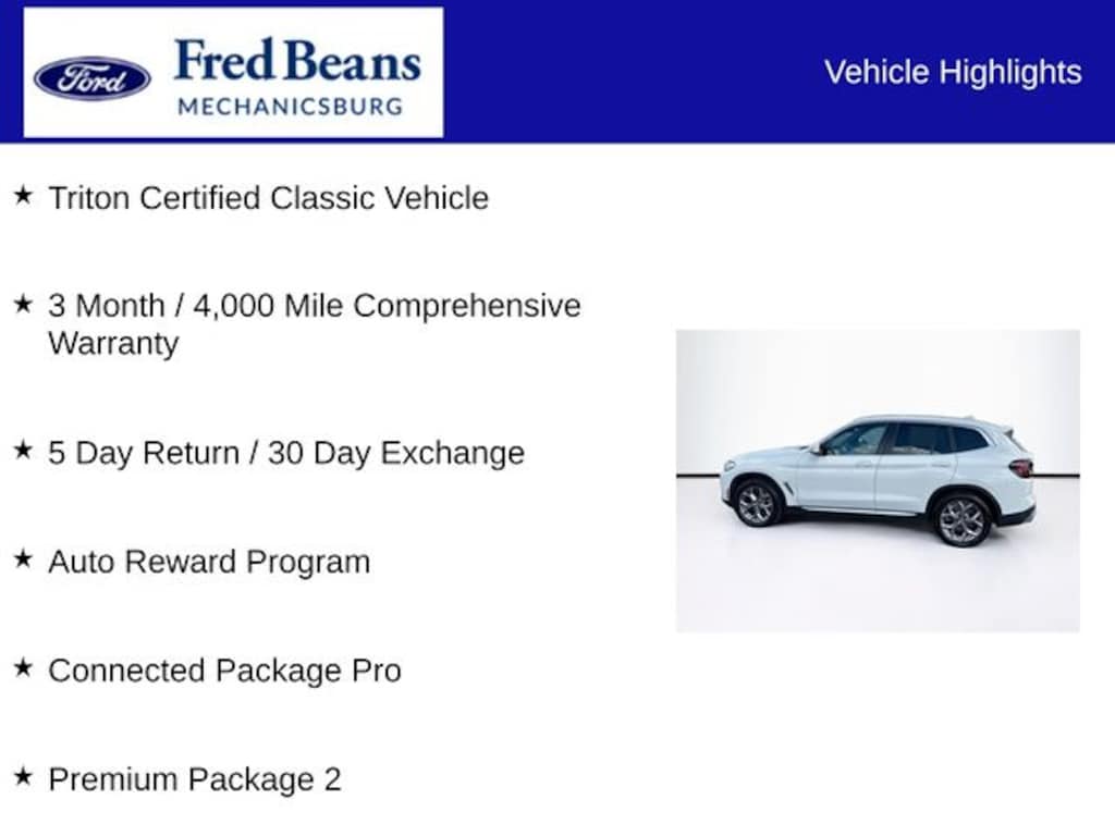 2022 BMW X3 xDrive30i 2.0L I4 TwinPower Turbo 8-Speed Automatic Sport AWD 4D Sport Utility Alpine White Triton Certified Classic Vehicle, 3 Month / 4,000 Mile Comprehensive Warranty, 5 Day Return / 30 Day Exchange, Auto Reward Program, 8-Speed Automatic Sport, Connected Package Pro, Gesture Control, Heated Front Seats, Heated Steering Wheel, Lumbar Support, Navigation, Panoramic Moonroof, Premium Package 2.