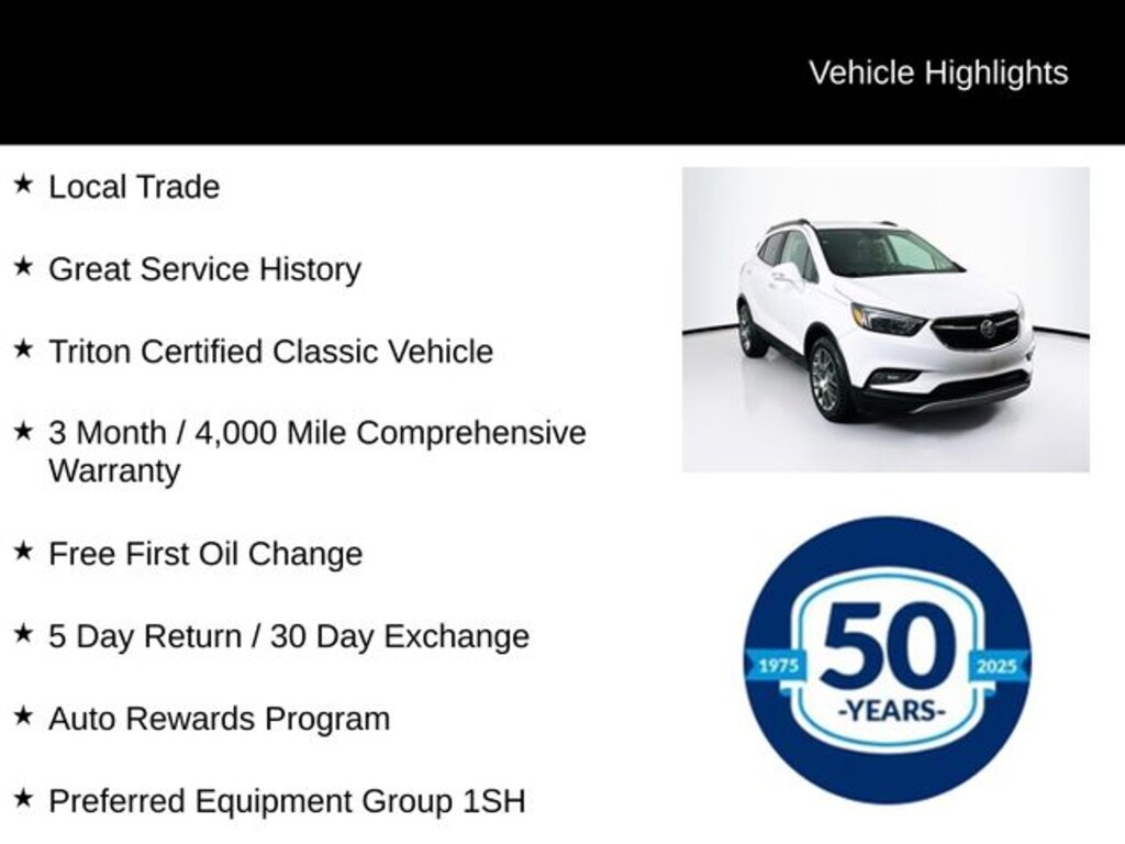 2018 Buick Encore Sport Touring Sport Touring ECOTEC 1.4L I4 SMPI DOHC Turbocharged VVT 6-Speed Automatic Electronic with Overdrive FWD 4D Sport Utility Summit White Local Trade, Great Service History, Triton Certified Classic Vehicle, 3 Month / 4,000 Mile Comprehensive Warranty, Free First Oil Change, 5 Day Return / 30 Day Exchange, Auto Rewards Program, 6-Way Power Driver Seat Adjuster, ABS brakes, Air Conditioning, Apple CarPlay/Android Auto, Brake assist, Cloth w/Leatherette Seat Trim, Electronic Stability Control, Emergency communication system: OnStar Guidance, Encore Sport Touring Package, Exterior Parking Camera Rear, Front Fog Lamps, Front fog lights, Fully automatic headlights, Power driver seat, Power Tilt-Sliding Moonroof, Preferred Equipment Group 1SH, Remote keyless entry, Remote Vehicle Starter System, Ride & Handling Suspension, Security system, Speed-sensing steering, Split folding rear seat, Steering wheel mounted audio controls, Telescoping steering wheel, Tilt steering wheel, Turn signal indicator mirrors, Wheels: 18" Midnight Silver Aluminum Alloy.