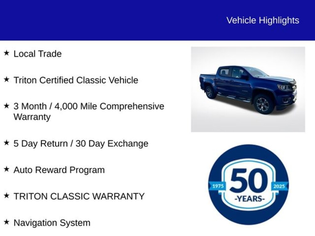 This Chevrolet Colorado Z71 is a Triton Certified Classic Vehicle, meaning it has undergone a rigorous 127-point inspection and comes with a 3 Month / 4,000 Mile Comprehensive Warranty for your peace of mind. The Bose Premium 7-Speaker Audio System and Chevrolet MyLink 8" Diagonal Color Touch Navigation will keep you entertained and connected on the road, while the Heavy-Duty Trailering Package ensures you have the capability to tow your toys with confidence.