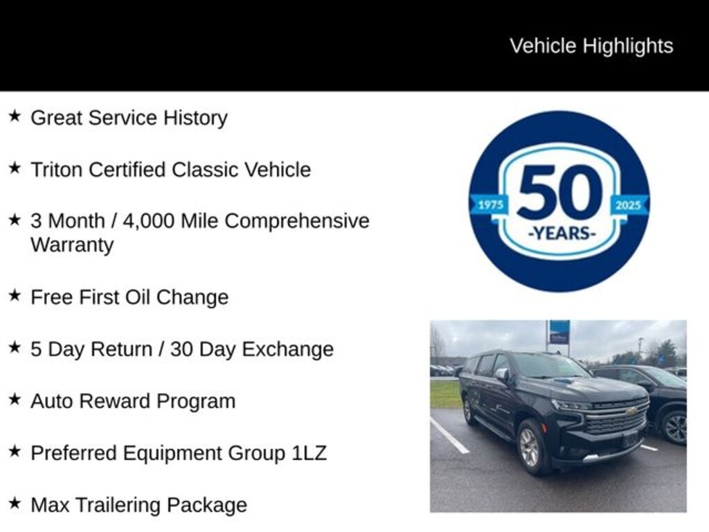 Recent Arrival! 2021 Chevrolet Suburban Premier EcoTec3 5.3L V8 10-Speed Automatic with Overdrive 4WD 4D Sport Utility Black Great Service History, Triton Certified Classic Vehicle, 3 Month / 4,000 Mile Comprehensive Warranty, Free First Oil Change, 5 Day Return / 30 Day Exchange, Auto Reward Program, 12-Way Power Driver & Passenger Seat Adjusters, 1st & 2nd Row Color-Keyed Carpeted Floor Mats, 2 USB Data Ports, 2-Speed Active Electronic AutoTrac Transfer Case, 3rd Row 60/40 Power-Folding Split-Bench, Adaptive Cruise Control, Advanced Trailering Package, Advanced Trailering System, Auto-Dimming Inside Rear-View Mirror, Automatic Heated Steering Wheel, Bose 10-Speaker Surround w/CenterPoint, Bright Front & Rear Door Sill Plates, Chrome Door Handles w/Body-Color Strip, Chrome Mirror Caps, Color-Keyed Carpeting Floor Covering, Driver & Front Outboard Passenger Airbags, Dual Exhaust System, Dual-Pane Power Panoramic Sunroof, Enhanced Display & Alert Package, Enhanced Driver Information Center, Floor Console w/Storage Area, Front & Rear Park Assist, Hands-Free Rear Power Programmable Liftgate, HD Radio, Heated & Ventilated Driver & Front Passenger Seats, Heated 2nd Row Outboard Seats, Heated Driver & Front Passenger Seats, Hill Descent Control, Hitch Guidance w/Hitch View, Infotainment Display, Integrated Trailer Brake Controller, Lane Change Alert w/Side Blind Zone Alert, Lane Keep Assist w/Lane Departure Warning, Leather-Wrapped Steering Wheel, LED Daytime Running Lamps, License Plate Front Mounting Package, Max Trailering Package, Memory Settings, Outside Heated Power-Adjustable Mirrors, Power Release 2nd Row Bucket Seats, Power Tilt & Telescopic Steering Column, Preferred Equipment Group 1LZ, Premium Package, Rear Cross Traffic Alert, Remote Start, Safety Alert Seat, SiriusXM Radio w/360L, Trailer Side Blind Zone Alert, Universal Home Remote.