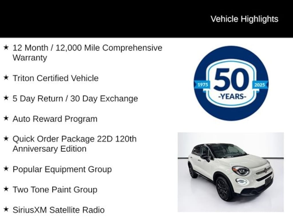 12 Month / 12,000 Mile Comprehensive Warranty, Triton Certified Vehicle, 5 Day Return / 30 Day Exchange, Auto Reward Program, 1-Yr SiriusXM Radio Service, 120th Anniversary Edition, Automatic Headlamps, Bi-Function LED Projector Headlamps, Black Bodyside Moldings, Black Instrument Panel, Black Mirror Caps, Black Painted Accent Roof, Chrome Surround Molding, Cloth Bucket Seats, Deep Tint Sunscreen Glass, ParkSense Rear Park Assist System, Popular Equipment Group, Quick Order Package 22D 120th Anniversary Edition, SiriusXM Satellite Radio, Two Tone Paint Group, Vinyl Door Trim Panel, Wheels: 18" x 7.0" Black Aluminum, 3.734 Axle Ratio, 4-Wheel Disc Brakes, 6 Speakers, ABS brakes, Air Conditioning, Alloy wheels, AM/FM radio, Anti-whiplash front head restraints, Brake assist, Bumpers: body-color, Cloth Low-Back Bucket Seats, Compass, Delay-off headlights, Driver door bin, Driver vanity mirror, Dual front impact airbags, Dual front side impact airbags, Dual-Pane Power Sunroof, Electronic Stability Control, Four wheel independent suspension, Front anti-roll bar, Front Bucket Seats, Front Center Armrest, Front reading lights, Heated door mirrors, Illuminated entry, Knee airbag, Leather Shift Knob, Leather steering wheel, Low tire pressure warning, Occupant sensing airbag, Outside temperature display, Overhead airbag, Overhead console, ParkView Rear Back-Up Camera, Passenger door bin, Passenger vanity mirror, Power door mirrors, Power steering, Power windows, Premium audio system: Uconnect 4, Radio data system, Radio: Uconnect 4 w/7" Display, Rear anti-roll bar, Rear window defroster, Rear window wiper, Remote keyless entry, Security system, Speed control, Speed-sensing steering, Split folding rear seat, Spoiler, Steering wheel mounted audio controls, Tachometer, Telescoping steering wheel, Tilt steering wheel, Traction control, Trip computer, Turn signal indicator mirrors, Variably intermittent wipers, Wheels: 17" x 7.0" Silver Aluminum, 1-Yr SiriusXM Radio Service, 120th Anniversary Edition, Automatic Headlamps, Bi-Function LED Projector Headlamps, Black Bodyside Moldings, Black Instrument Panel, Black Mirror Caps, Black Painted Accent Roof, Chrome Surround Molding, Cloth Bucket Seats, Deep Tint Sunscreen Glass, ParkSense Rear Park Assist System, Popular Equipment Group, Quick Order Package 22D 120th Anniversary Edition, SiriusXM Satellite Radio, Two Tone Paint Group, Vinyl Door Trim Panel, Wheels: 18" x 7.0" Black Aluminum.