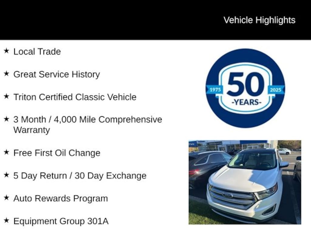 Recent Arrival! 2017 Ford Edge Titanium Titanium EcoBoost 2.0L I4 GTDi DOHC Turbocharged VCT 6-Speed Automatic AWD 4D Sport Utility White Platinum Local Trade, Great Service History, Triton Certified Classic Vehicle, 3 Month / 4,000 Mile Comprehensive Warranty, Free First Oil Change, 5 Day Return / 30 Day Exchange, Auto Rewards Program, AWD, Auto-dimming Rear-View mirror, BLIS Blind Spot Information System, Cold Weather Package, Equipment Group 301A, Exterior Parking Camera Rear, Front & Rear Floor Liners, Front dual zone A/C, Heated door mirrors, Heated Rear-Seats, Heated Steering Wheel, Illuminated entry, Leather Shift Knob, Memory seat, Panoramic Vista Roof, Perforated Leather Trimmed Heated/Cooled Buckets, Power door mirrors, Power driver seat, Power Liftgate, Power passenger seat, Radio: AM/FM Stereo w/Single CD/Navigation, Remote keyless entry, SiriusXM Radio, SiriusXM Traffic & Travel Link, Steering wheel mounted audio controls, Technology Package, Turn signal indicator mirrors, Wheels: 20" Bright Machined Aluminum.