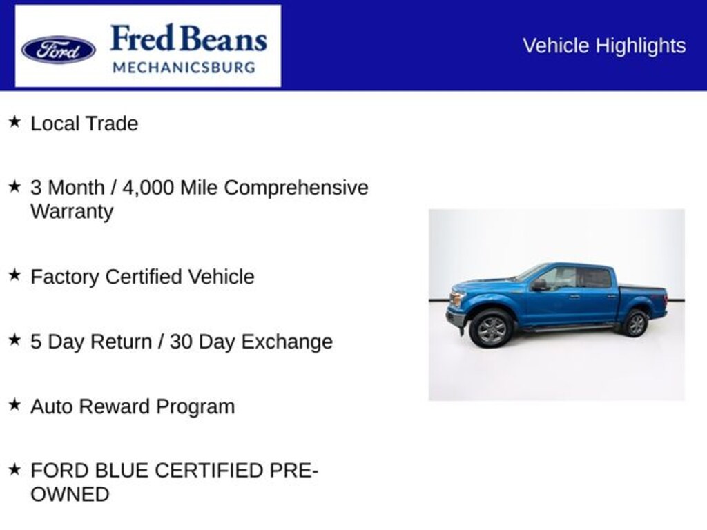 Recent Arrival! 2019 Ford F-150 XLT 5.0L V8 10-Speed Automatic 4WD 4D SuperCrew Blue Local Trade, 3 Month / 4,000 Mile Comprehensive Warranty, Factory Certified Vehicle, 5 Day Return / 30 Day Exchange, Auto Reward Program, Ford Blue Certified Certified, 4WD, 2-Bar Style Grille w/Chrome 2 Minor Bars, 4-Wheel Disc Brakes, 6 Speakers, ABS brakes, Air Conditioning, Alloy wheels, AM/FM radio, AppLink/Apple CarPlay and Android Auto, Auto High-beam Headlights, Auto-Dimming Rear-View Mirror, BoxLink, Brake assist, Bumpers: chrome, Chrome Door & Tailgate Handles w/Body-Color Bezel, Chrome Step Bars, Class IV Trailer Hitch Receiver, Compass, Delay-off headlights, Driver door bin, Driver vanity mirror, Dual front impact airbags, Dual front side impact airbags, Electronic Stability Control, Emergency communication system: SYNC 3 911 Assist, Equipment Group 302A Luxury, Extended Range 36 Gallon Fuel Tank, Exterior Parking Camera Rear, Front anti-roll bar, Front Center Armrest w/Storage, Front fog lights, Front License Plate Bracket, Front wheel independent suspension, Fully automatic headlights, FX4 Off-Road Package, Illuminated entry, Integrated Trailer Brake Controller, LED Box Lighting, LED Sideview Mirror Spotlights, Low tire pressure warning, Occupant sensing airbag, Outside temperature display, Overhead airbag, Panic alarm, Passenger door bin, Passenger vanity mirror, Power door mirrors, Power Glass Heated Sideview Mirrors, Power steering, Power windows, Power-Sliding Rear Window, Radio data system, Radio: AM/FM Stereo w/6 Speakers, Rear step bumper, Rear Window Defroster, Remote keyless entry, Remote Start System, Reverse Sensing System, Security system, Single-Tip Chrome Exhaust, SiriusXM Radio, Speed control, Speed-sensing steering, Split folding rear seat, Steering wheel mounted audio controls, SYNC 3, Tachometer, Tailgate Step w/Tailgate Lift Assist, Telescoping steering wheel, Tilt steering wheel, Traction control, Tray Style Floor Liner, Variably intermittent wipers, Voltmeter, Wheels: 17" Silver Painted Aluminum, Wheels: 18" Chrome-Like PVD, XLT Chrome Appearance Package, XLT Power Equipment Group, FORD BLUE CERTIFIED PRE-OWNED, 4WD.