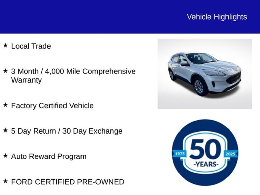 As a Ford Certified Pre-Owned vehicle, this Escape has undergone a rigorous 139-point inspection and comes with a comprehensive warranty, roadside assistance, and a vehicle history report. Plus, you'll receive 11,000 FordPass Rewards Points to use towards your first maintenance visit, giving you added peace of mind and value.