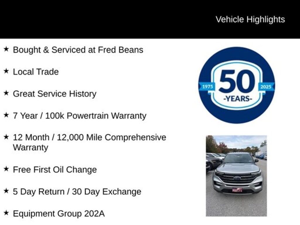 As a Ford Gold Certified pre-owned vehicle, this Explorer XLT comes with a transferable warranty, a 12-month/12,000-mile limited warranty, and an 84-month/100,000-mile powertrain warranty. Additionally, you'll receive 22,000 FordPass Rewards Points to use towards your first two maintenance visits, ensuring that your ownership experience is as seamless and worry-free as possible.