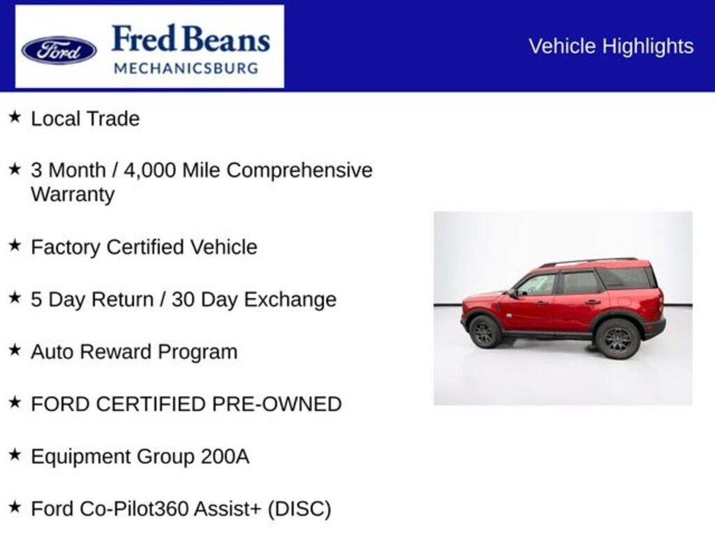 As a Ford Certified Pre-Owned vehicle, this Bronco Sport has undergone a rigorous 127-point inspection and comes with a 3-month/4,000-mile comprehensive warranty. You can drive with the peace of mind knowing that this SUV has been meticulously maintained and is ready to provide years of reliable service.