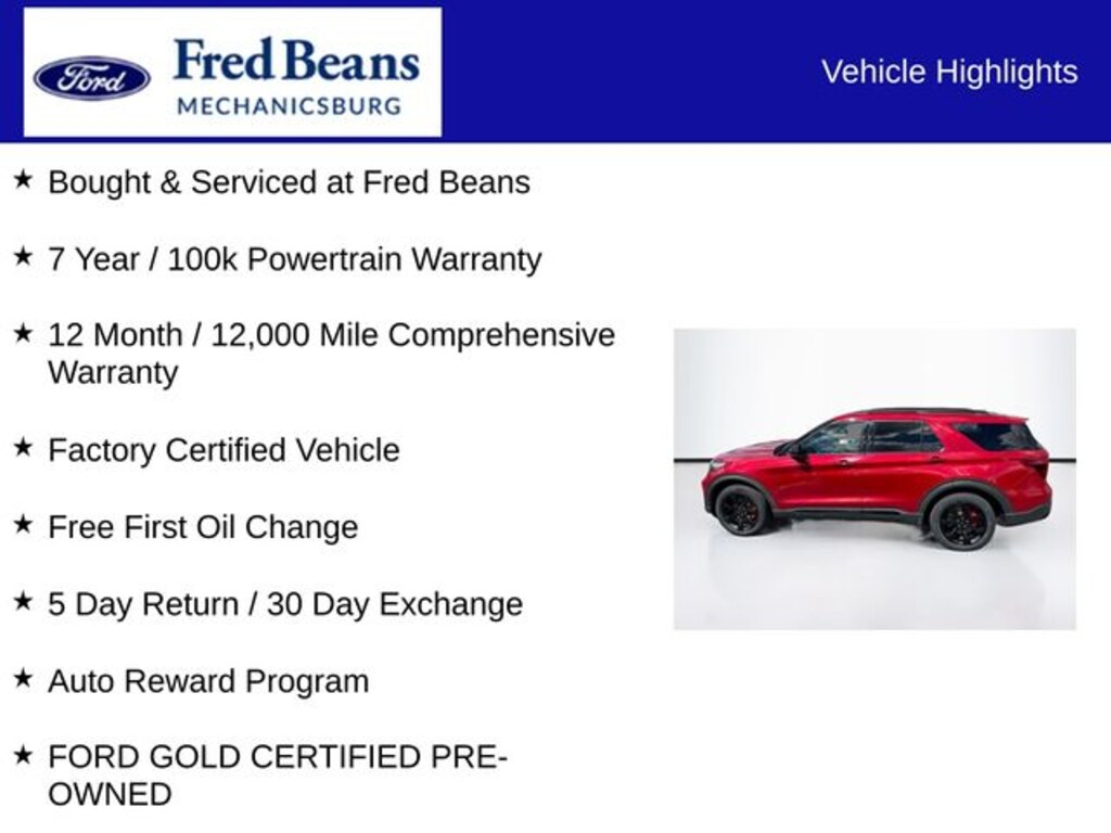 2021 Ford Explorer ST 3.0L EcoBoost V6 10-Speed Automatic 4WD 4D Sport Utility Rapid Red Metallic Tinted Clearcoat Bought & Serviced at Fred Beans, 7 Year / 100k Powertrain Warranty, 12 Month / 12,000 Mile Comprehensive Warranty, Factory Certified Vehicle, Free First Oil Change, 5 Day Return / 30 Day Exchange, Auto Reward Program, Ford Certified, 4WD, 10.1" LCD Capacitive Portrait Touchscreen, 2 Additional Speakers, Equipment Group 401A, Evasive Steering Assist, Ford Co-Pilot360 Assist+, Intelligent Adaptive Cruise Control, Leather Htd/Ventilated Sport Captain's Chairs, Navigation System, Premium Technology Package, Speed Sign Recognition, ST High Package, ST Street Pack, 110V/150W AC Power Outlet, 20" Machined Aluminum w/Painted Pockets Wheels, 3.58 Non-Limited-Slip Rear Axle Ratio, 360-Degree Camera w/Split View, 3rd row seats: bench, 4-Wheel Disc Brakes, 6 Speakers, ABS brakes, Active Park Assist 2.0, Air Conditioning, Alloy wheels, AM/FM radio: SiriusXM, AM/FM Stereo, Auto High-beam Headlights, Auto-Dimming Rearview Mirror (Interior), Automatic temperature control, Black Roof-Rack Side Rails, Brake assist, Bumpers: body-color, Compass, Delay-off headlights, Driver door bin, Driver vanity mirror, Dual front impact airbags, Dual front side impact airbags, Electronic Stability Control, Emergency communication system: SYNC 3 911 Assist, Exterior Parking Camera Rear, FordPass Connect, Forward Sensing System, Four wheel independent suspension, Front anti-roll bar, Front Bucket Seats, Front Center Armrest, Front dual zone A/C, Front fog lights, Front Rain-Sensing Wipers, Front reading lights, Fully automatic headlights, Hands-Free Foot-Activated Liftgate, Heated door mirrors, Heated front seats, Heated steering wheel, Illuminated entry, Knee airbag, Leather steering wheel, Low tire pressure warning, Memory Driver's Seat, Occupant sensing airbag, Outside temperature display, Overhead airbag, Overhead console, Panic alarm, Passenger door bin, Passenger vanity mirror, Performance Front & Rear Brakes, Power door mirrors, Power driver seat, Power Liftgate, Power passenger seat, Power steering, Power Tilt/Telescoping Steering Column, Power windows, Radio: B&O Sound System by Bang & Olufsen, Rear air conditioning, Rear anti-roll bar, Rear reading lights, Rear window defroster, Rear window wiper, Remote keyless entry, Reverse Brake Assist, Second Row Heated Seats, Security system, SelectShift Capability w/Paddle Shifters, Sideview Mirrors w/Gloss Black Caps, Speed control, Speed-sensing steering, Speed-Sensitive Wipers, Split folding rear seat, Spoiler, Sport steering wheel, Steering wheel mounted audio controls, SYNC 3 Communications & Entertainment System, SYNC 3/Apple CarPlay/Android Auto, Tachometer, Telescoping steering wheel, Third Row PowerFold (Folds Flat), Tilt steering wheel, Traction control, Trip computer, Twin Panel Moonroof, Universal Garage Door Opener (UGDO), Variably intermittent wipers, Voice-Activated Touchscreen Navigation System, Wheels: 21" Aluminum, Wireless Charging Pad, FORD GOLD CERTIFIED PRE-OWNED, 4WD, 10.1" LCD Capacitive Portrait Touchscreen, 2 Additional Speakers, Equipment Group 401A, Evasive Steering Assist, Ford Co-Pilot360 Assist+, Intelligent Adaptive Cruise Control, Leather Htd/Ventilated Sport Captain's Chairs, Navigation System, Premium Technology Package, Speed Sign Recognition, ST High Package, ST Street Pack.
