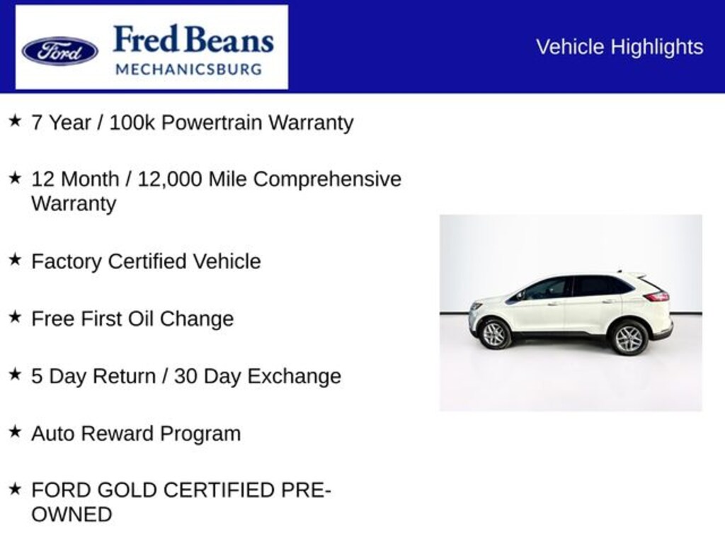 2022 Ford Edge SEL EcoBoost 2.0L I4 GTDi DOHC Turbocharged VCT 8-Speed Automatic AWD 4D Sport Utility Oxford White 7 Year / 100k Powertrain Warranty, 12 Month / 12,000 Mile Comprehensive Warranty, Factory Certified Vehicle, Free First Oil Change, 5 Day Return / 30 Day Exchange, Auto Reward Program, Ford Certified, AWD, 110V/150W AC Power Outlet, 3.80 Axle Ratio, 4-Wheel Disc Brakes, 6 Speakers, ABS brakes, ActiveX Seating Material Heated Bucket Seats, Air Conditioning, Alloy wheels, AM/FM radio: SiriusXM with 360L, Auto High-beam Headlights, Auto-dimming Rear-View mirror, Automatic temperature control, Brake assist, Bumpers: body-color, Compass, Convenience Package, Delay-off headlights, Driver door bin, Driver vanity mirror, Dual front impact airbags, Dual front side impact airbags, Electronic Stability Control, Emergency communication system: SYNC 4 911 Assist, Equipment Group 201A, Fog Lamps w/Chrome Bezel, FordPass Connect, Four wheel independent suspension, Front anti-roll bar, Front Bucket Seats, Front Center Armrest w/Storage, Front dual zone A/C, Front reading lights, Fully automatic headlights, Heated door mirrors, Heated front seats, Heated Steering Wheel, Illuminated entry, Knee airbag, Low tire pressure warning, Occupant sensing airbag, Outside temperature display, Overhead airbag, Overhead console, Panic alarm, Panoramic Vista Roof, Passenger door bin, Passenger vanity mirror, Perimeter Alarm, Power door mirrors, Power driver seat, Power Liftgate, Power passenger seat, Power steering, Power windows, Radio: AM/FM Stereo/MP3 Capable, Rear anti-roll bar, Rear Parking Sensors, Rear reading lights, Rear seat center armrest, Rear window defroster, Rear window wiper, Remote keyless entry, Remote Start System, SecuriCode Keyless Entry Keypad, SiriusXM w/360L, Speed control, Speed-Sensitive Wipers, Split folding rear seat, Spoiler, Steering wheel mounted audio controls, SYNC 4A w/Enhanced Voice Recognition, Tachometer, Telescoping steering wheel, Tilt steering wheel, Traction control, Trip computer, Universal Garage Door Opener (UGDO), Variably intermittent wipers, Wheels: 18" Sparkle Silver-Painted Aluminum, Wireless Charging Pad, FORD GOLD CERTIFIED PRE-OWNED, AWD.