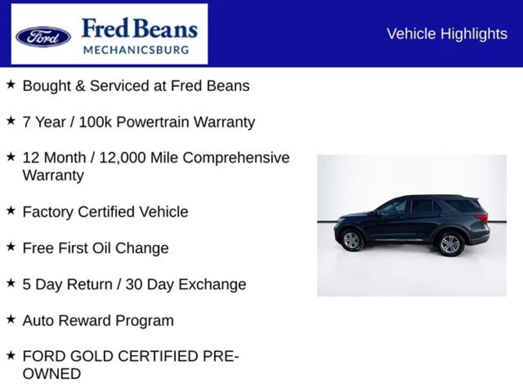 2022 Ford Explorer XLT 2.3L EcoBoost I-4 10-Speed Automatic 4WD 4D Sport Utility Stone Blue Metallic Bought & Serviced at Fred Beans, 7 Year / 100k Powertrain Warranty, 12 Month / 12,000 Mile Comprehensive Warranty, Factory Certified Vehicle, Free First Oil Change, 5 Day Return / 30 Day Exchange, Auto Reward Program, Ford Certified, 4WD, 1st Row Heated Seats, 3.58 Non-Limited-Slip Rear Axle Ratio, 3rd row seats: bench, 4-Wheel Disc Brakes, 4G LTE Wi-Fi Hotspot Removal Credit, 6 Speakers, ABS brakes, Air Conditioning, Alloy wheels, AM/FM radio: SiriusXM, AM/FM Stereo, Auto High-beam Headlights, Auto Start-Stop Removal, Automatic temperature control, Brake assist, Bumpers: body-color, Class IV Trailer Tow Package, Compass, Delay-off headlights, Driver door bin, Driver vanity mirror, Dual front impact airbags, Dual front side impact airbags, Electronic Stability Control, Emergency communication system: SYNC 3 911 Assist, Equipment Group 200A, Exterior Parking Camera Rear, FordPass Connect, Four wheel independent suspension, Front anti-roll bar, Front Bucket Seats, Front Center Armrest, Front dual zone A/C, Front reading lights, Fully automatic headlights, Heated door mirrors, Heated front seats, Illuminated entry, Knee airbag, Leather steering wheel, Low tire pressure warning, Occupant sensing airbag, Outside temperature display, Overhead airbag, Overhead console, Panic alarm, Passenger door bin, Passenger vanity mirror, Power door mirrors, Power driver seat, Power Liftgate, Power passenger seat, Power steering, Power windows, Rear air conditioning, Rear anti-roll bar, Rear reading lights, Rear window defroster, Rear window wiper, Remote keyless entry, Roof rack: rails only, Security system, Speed control, Speed-sensing steering, Speed-Sensitive Wipers, Split folding rear seat, Spoiler, Steering wheel mounted audio controls, SYNC 3 Communications & Entertainment System, SYNC 3/Apple CarPlay/Android Auto, Tachometer, Telescoping steering wheel, Tilt steering wheel, Traction control, Trip computer, Unique Cloth Captain's Chairs, Variably intermittent wipers, Wheels: 18" 5-Spoke Silver-Painted Aluminum, FORD GOLD CERTIFIED PRE-OWNED, 4WD.