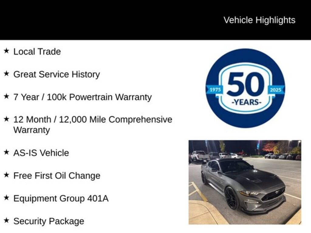 Recent Arrival! 2022 Ford Mustang GT Premium 5.0L V8 Ti-VCT 10-Speed Automatic RWD 2D Coupe Carbonized Gray Metallic Local Trade, Great Service History, 7 Year / 100k Powertrain Warranty, 12 Month / 12,000 Mile Comprehensive Warranty, AS-IS Vehicle, Free First Oil Change, 12" LCD Digital Instrument Cluster w/MyColor, Active Anti-Theft System, Air Conditioning, Equipment Group 401A, Exterior Parking Camera Rear, Ford Safe & Smart Package, Four wheel independent suspension, Heated Steering Wheel, Leather-Trimmed Bucket Seats w/Color Accents, Memory Driver Seat, Mirrors & Ambient Lighting, Radio data system, Rear Parking Sensors, Rear window defroster, Security Package, Speed-sensing steering, Traction control, Wheel Locking Kit.