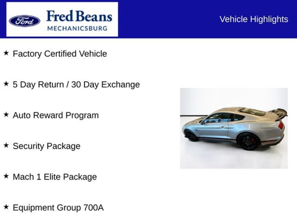2022 Ford Mustang Mach 1 5.0L V8 Ti-VCT Tremec 6-Speed Manual RWD 2D Coupe Silver Metallic Factory Certified Vehicle, 5 Day Return / 30 Day Exchange, Auto Reward Program, Aluminum Foot Pedals, Climate Controlled Heated/Cooled Front Seats, Cloth Bucket Seats w/Color Accent, Equipment Group 700A, Heated Steering Wheel, Mach 1 Elite Package, Memory Driver Seat, Mirrors & Ambient Lighting, Radio: B&O Sound System by Bang & Olufsen, Seat Back Map Pockets, Security Package.