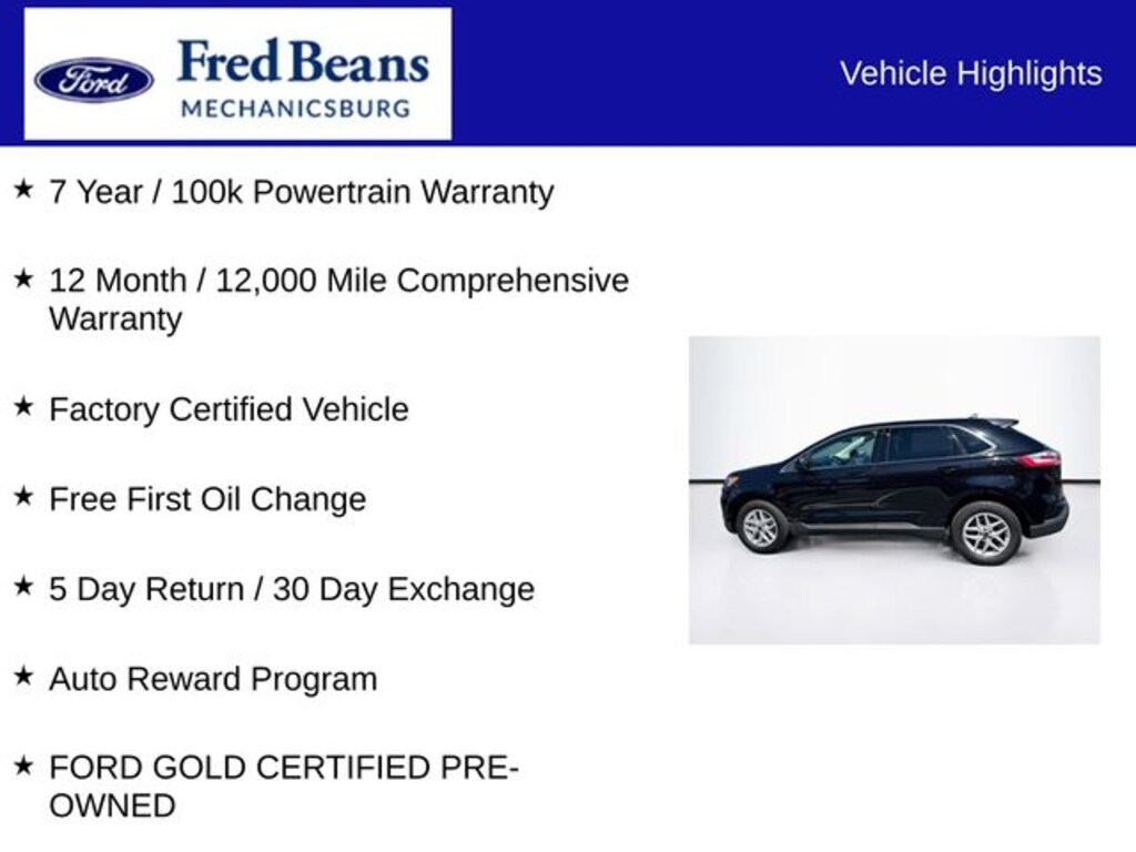 2023 Ford Edge SEL EcoBoost 2.0L I4 GTDi DOHC Turbocharged VCT 8-Speed Automatic AWD 4D Sport Utility Agate Black Metallic 7 Year / 100k Powertrain Warranty, 12 Month / 12,000 Mile Comprehensive Warranty, Factory Certified Vehicle, Free First Oil Change, 5 Day Return / 30 Day Exchange, Auto Reward Program, Ford Certified, AWD, Navigation System, 110V/150W AC Power Outlet, 3.80 Axle Ratio, 4-Wheel Disc Brakes, 6 Speakers, ABS brakes, ActiveX Seating Material Heated Bucket Seats, Adaptive Cruise Control w/Stop & Go, Air Conditioning, Alloy wheels, AM/FM radio: SiriusXM with 360L, Auto High-beam Headlights, Auto-dimming Rear-View mirror, Automatic temperature control, Brake assist, Bumpers: body-color, Compass, Connected Built-In Navigation, Convenience Package, Delay-off headlights, Driver door bin, Driver vanity mirror, Dual front impact airbags, Dual front side impact airbags, Electronic Stability Control, Emergency communication system: SYNC 4 911 Assist, Equipment Group 201A, Evasive Steering Assist, Fog Lamps w/Iconic Silver Bezel, Ford Co-Pilot360 Assist+, FordPass Connect, Four wheel independent suspension, Front & Rear Floor Liners w/o Carpet Mats, Front anti-roll bar, Front Bucket Seats, Front Center Armrest w/Storage, Front dual zone A/C, Front reading lights, Fully automatic headlights, Heated door mirrors, Heated front seats, Heated Steering Wheel, Illuminated entry, Knee airbag, Lane Centering, Leather steering wheel, Leather-Wrapped Steering Wheel, Low tire pressure warning, Occupant sensing airbag, Outside temperature display, Overhead airbag, Overhead console, Panic alarm, Passenger door bin, Passenger vanity mirror, Perimeter Alarm, Power door mirrors, Power driver seat, Power Liftgate, Power passenger seat, Power steering, Power windows, Radio: AM/FM Stereo/MP3 Capable, Rear anti-roll bar, Rear Parking Sensors, Rear reading lights, Rear seat center armrest, Rear window defroster, Rear window wiper, Remote keyless entry, Remote Start System, SiriusXM w/360L, Speed control, Speed-Sensitive Wipers, Split folding rear seat, Spoiler, Steering wheel mounted audio controls, SYNC 4A w/Enhanced Voice Recognition, Tachometer, Telescoping steering wheel, Tilt steering wheel, Traction control, Trip computer, Universal Garage Door Opener (UGDO), Variably intermittent wipers, Wheels: 18" Sparkle Silver-Painted Aluminum, Wireless Charging Pad, FORD GOLD CERTIFIED PRE-OWNED, AWD, Navigation System.