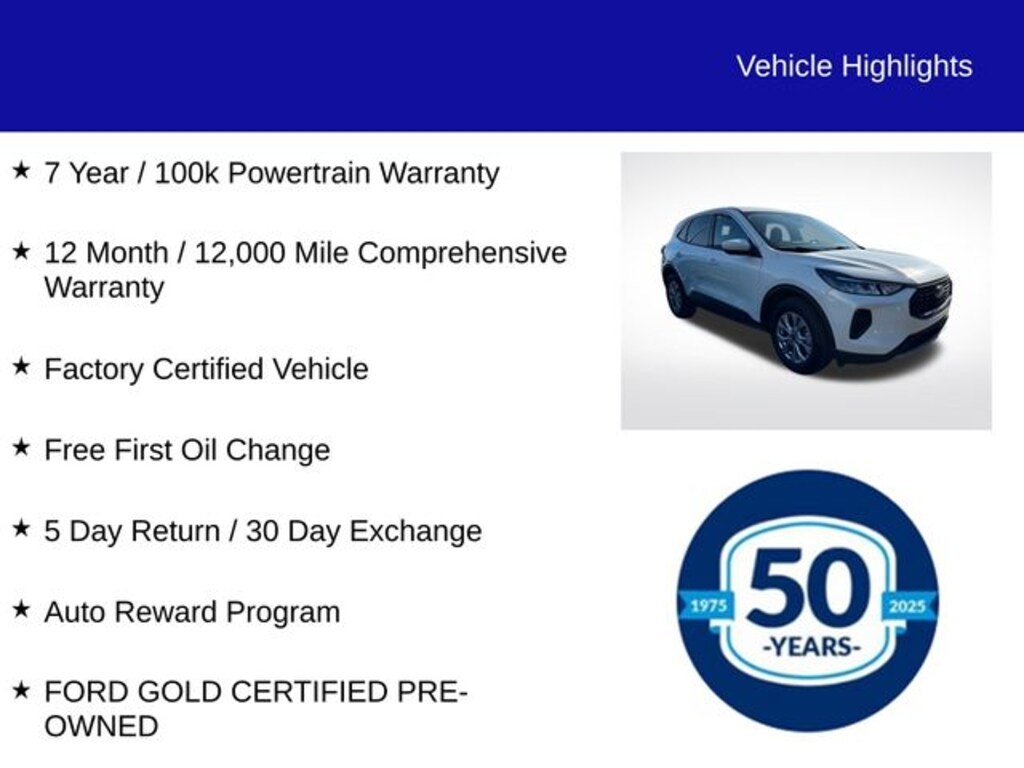 2023 Ford Escape Active 1.5L EcoBoost 8-Speed Automatic AWD 4D Sport Utility Star White Metallic Tri-Coat 7 Year / 100k Powertrain Warranty, 12 Month / 12,000 Mile Comprehensive Warranty, Factory Certified Vehicle, Free First Oil Change, 5 Day Return / 30 Day Exchange, Auto Reward Program, Ford Certified, AWD, 10-Way Power Driver's Seat, 12.3" Productivity Screen in Instrument Cluster, 3.81 Axle Ratio, 360-Degree Camera w/Split View, 4-Wheel Disc Brakes, 6 Speakers, 6-Way Power Passenger Seat, ABS brakes, Air Conditioning, Alloy wheels, AM/FM radio: SiriusXM, AM/FM Stereo, Auto High-beam Headlights, Automatic temperature control, Body Color Mirrors, Brake assist, Bumpers: body-color, Compass, Connected Built-In Navigation, Delay-off headlights, Driver door bin, Driver vanity mirror, Dual front impact airbags, Dual front side impact airbags, Electronic Stability Control, Emergency communication system: SYNC 4 911 Assist, Equipment Group 200A, Exterior Parking Camera Rear, Ford Co-Pilot360 Assist 2.0, FordPass Connect, Four wheel independent suspension, Front anti-roll bar, Front Bucket Seats, Front Center Armrest, Front dual zone A/C, Front reading lights, Fully automatic headlights, HD Radio, Heated door mirrors, Heated front seats, Heated steering wheel, Illuminated entry, Intelligent Adaptive Cruise Control w/Stop-and-Go, Intersection Assist, Knee airbag, Low tire pressure warning, Memory Package, Occupant sensing airbag, Outside temperature display, Overhead airbag, Overhead console, Panic alarm, Passenger door bin, Passenger vanity mirror, Power door mirrors, Power driver seat, Power Liftgate, Power steering, Power windows, Radio data system, Radio: B&O Sound System by Bang & Olufsen, Rear anti-roll bar, Rear Parking Sensor, Rear reading lights, Rear seat center armrest, Rear window defroster, Rear window wiper, Remote keyless entry, Reverse Brake Assist, SecuriCode Keyless Entry Keypad, Speed control, Speed Sign Recognition, Speed-sensing steering, Speed-Sensitive Wipers, Split folding rear seat, Spoiler, Steering wheel mounted audio controls, SYNC 4, SYNC 4 w/Enhanced Voice Recognition, Tachometer, Tech Pack #2, Telescoping steering wheel, Tilt steering wheel, Traction control, Trip computer, Unique Cloth Front Bucket Seats, Variably intermittent wipers, Wheels: 17" Shadow Silver-Painted Aluminum, Wireless Charging Pad, FORD GOLD CERTIFIED PRE-OWNED, AWD.