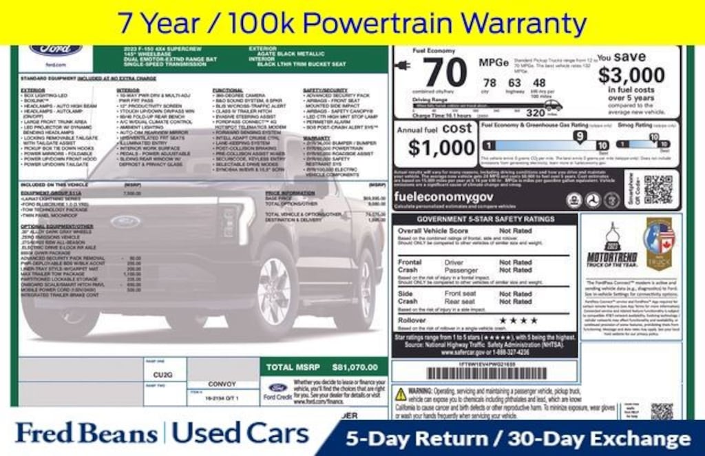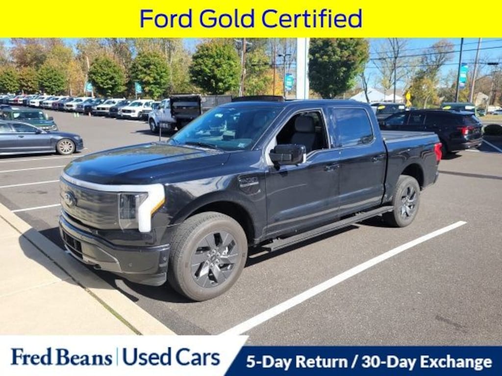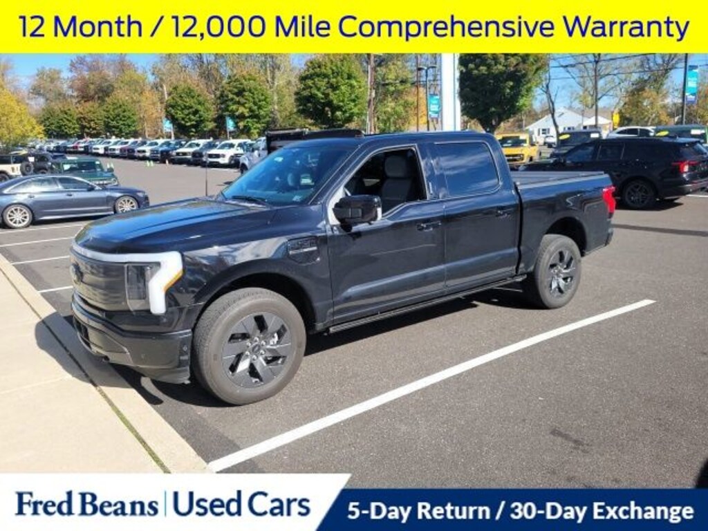 Recent Arrival! 2023 Ford F-150 Lightning Lariat Electric Motor Single-Speed Automatic AWD 4D Crew Cab Agate Black Metallic Ford Gold Certified, 7 Year / 100k Powertrain Warranty, 12 Month / 12,000 Mile Comprehensive Warranty, Bought & Serviced at Fred Beans, 2nd Row Heated Seats, Active Park Assist 2.0, Automatic temperature control, Equipment Group 511A High, Ford BlueCruise 1.0, Forward Sensing System, Max Trailer Tow Package, Memory seat, Navigation System, Pedal memory, Power Tilt/Telescoping Steering Column w/Memory, Radio: B&O Sound System by Bang & Olufsen, Rain-Sensing Wipers, SYNC 4A w/Enhanced Voice Recognition, Tow Technology Package, Trailer Brake Controller, Twin Panel Moonroof. 78/63 City/Highway MPG