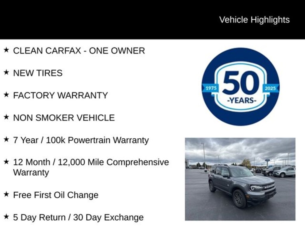 CLEAN CARFAX - ONE OWNER, NEW TIRES, FACTORY WARRANTY, NON SMOKER VEHICLE, 7 Year / 100k Powertrain Warranty, 12 Month / 12,000 Mile Comprehensive Warranty, Free First Oil Change, 5 Day Return / 30 Day Exchange, Auto Reward Program, CALL NOW!!! 908-835-8100. Recent Arrival! 2024 Ford Bronco Sport Big Bend 1.5L EcoBoost 8-Speed Automatic 4WD 4D Sport Utility Gray Metallic 25/29 City/Highway MPG