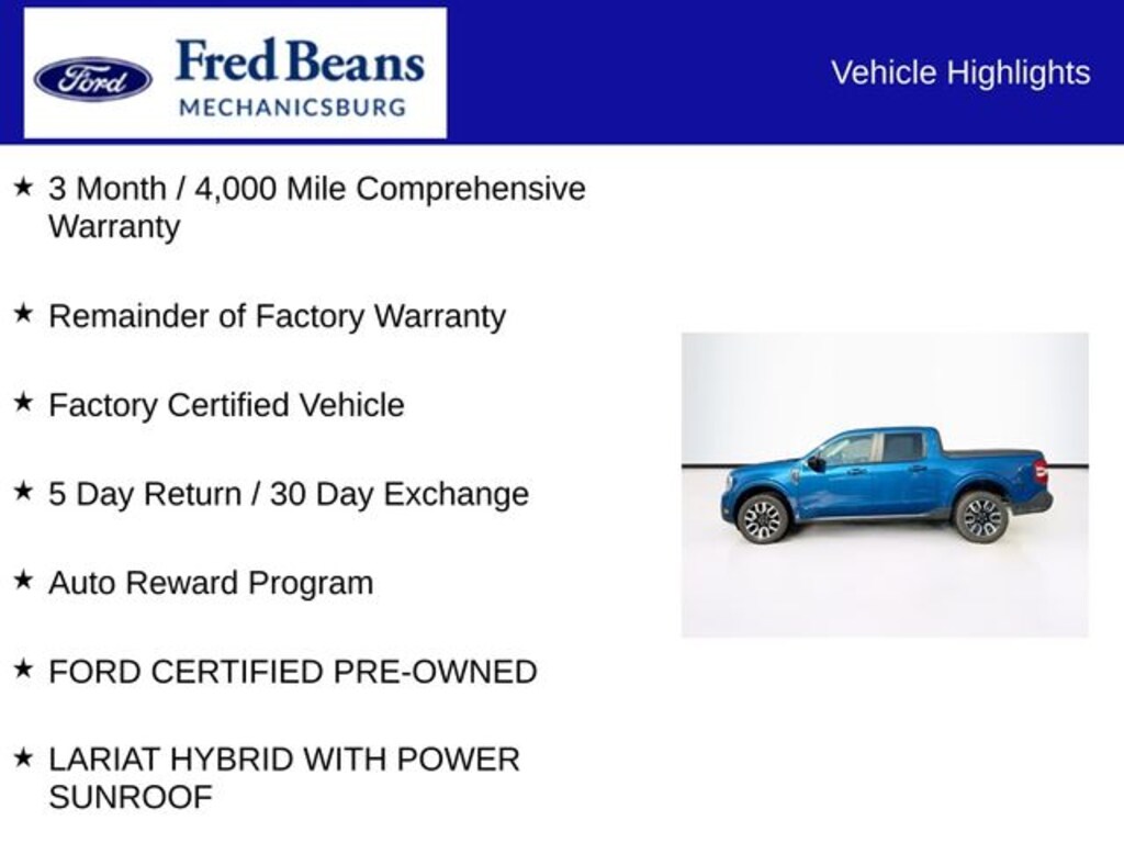 Discover the exceptional 2024 Ford Maverick Lariat, a versatile and efficient hybrid that combines style, performance, and unparalleled value. This certified pre-owned gem boasts a striking blue exterior and a host of premium features that elevate your driving experience.