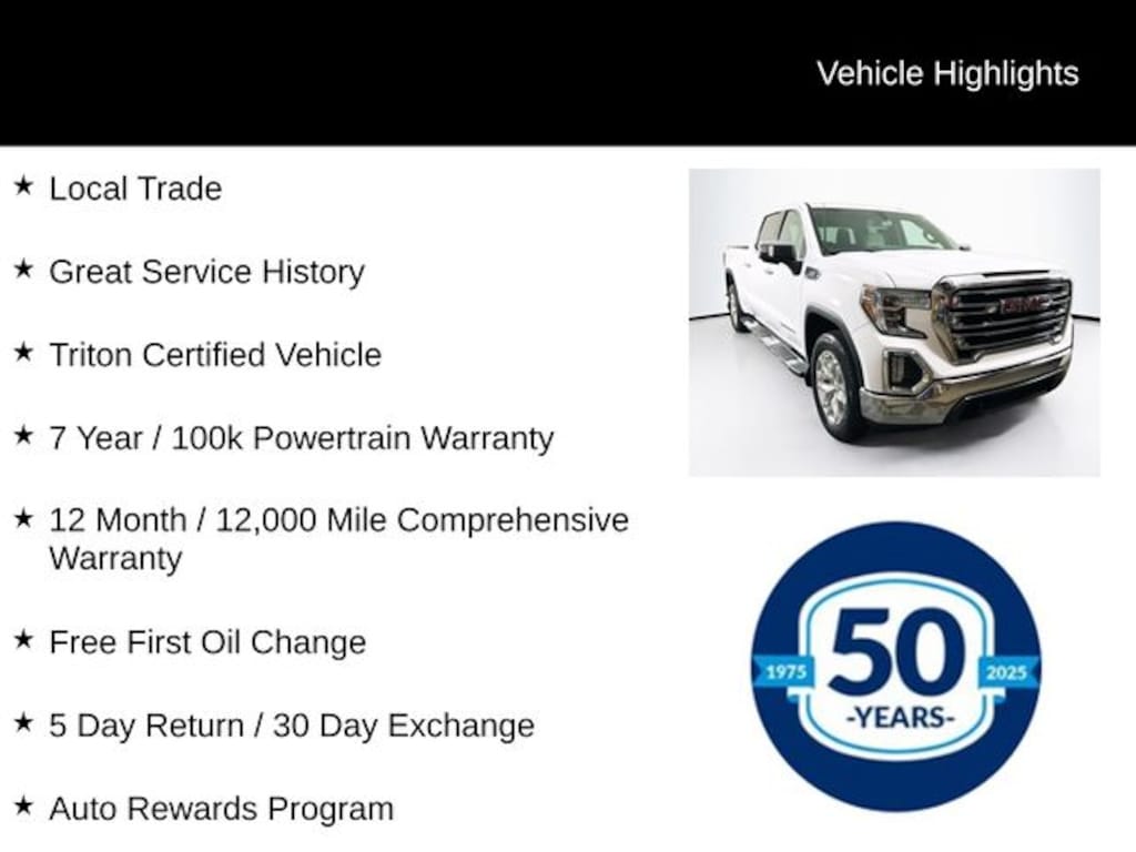 Certified. Certification Program Details: Triton Certified Shield • 7-Year or up to 100,000-Mile Powertrain Limited Warranty • 12-Month or 12,000-Mile Comprehensive Coverage ($100 deductible) • 100+ Multipoint Inspection • All Fluids Checked • Tires 6/32" or Better • 50% or Better brakes • Oil, Lube, & Filter Service Completed • PA State Inspection & Emissions Test • 5-Day Return Policy1 • 30-Day Exchange Policy2 • CARFAXTM Report • AutoRewards Membership • See salesperson for additional offers & complete details.