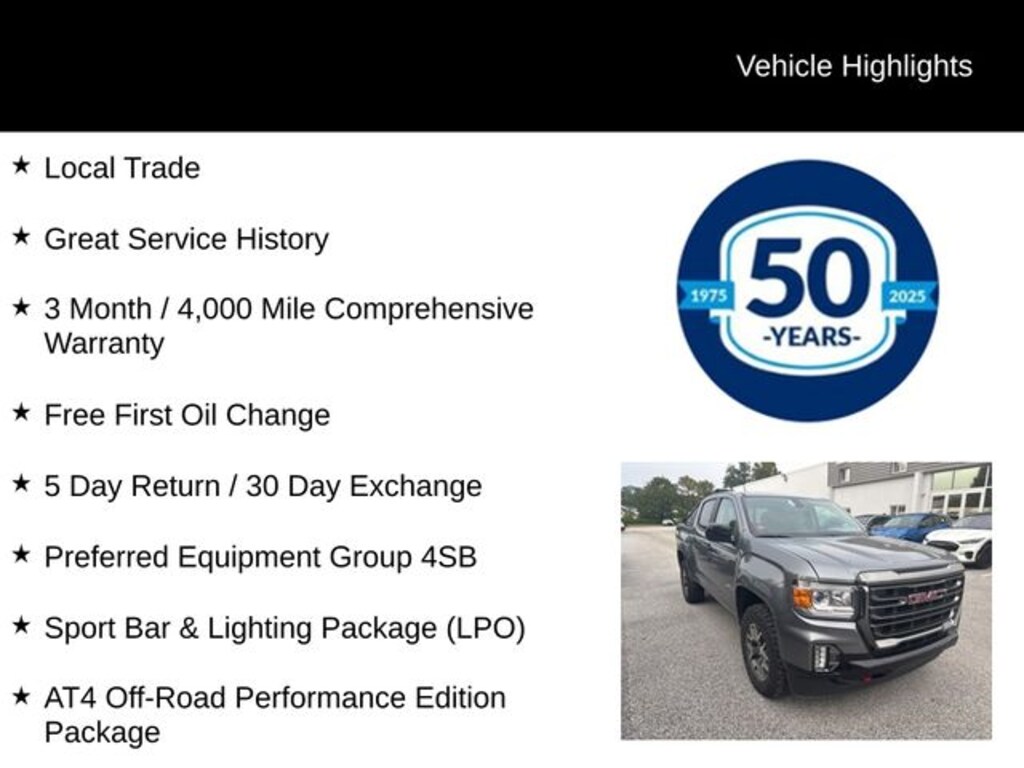 Recent Arrival! 2022 GMC Canyon AT4 w/Leather V6 8-Speed Automatic 4WD 4D Crew Cab Satin Steel Metallic Local Trade, Great Service History, 3 Month / 4,000 Mile Comprehensive Warranty, Free First Oil Change, 5 Day Return / 30 Day Exchange, 4WD, 3 Years of OnStar & Connected Services Plan (DISC), AT4 Off-Road Performance Edition Package, Bed-Mounted Tubular Sport Bar (LPO), Bose Premium 7-Speaker Audio System Feature, Exterior Parking Camera Rear, Heated Driver & Front Passenger Seats, Heated Steering Wheel, Off-Road Lights (LPO), Power driver seat, Preferred Equipment Group 4SB, Radio: AM/FM w/8" Diagonal Multi-Touch Display Nav, Sport Bar & Lighting Package (LPO), Wireless Charging for Compatible Cell Phones.