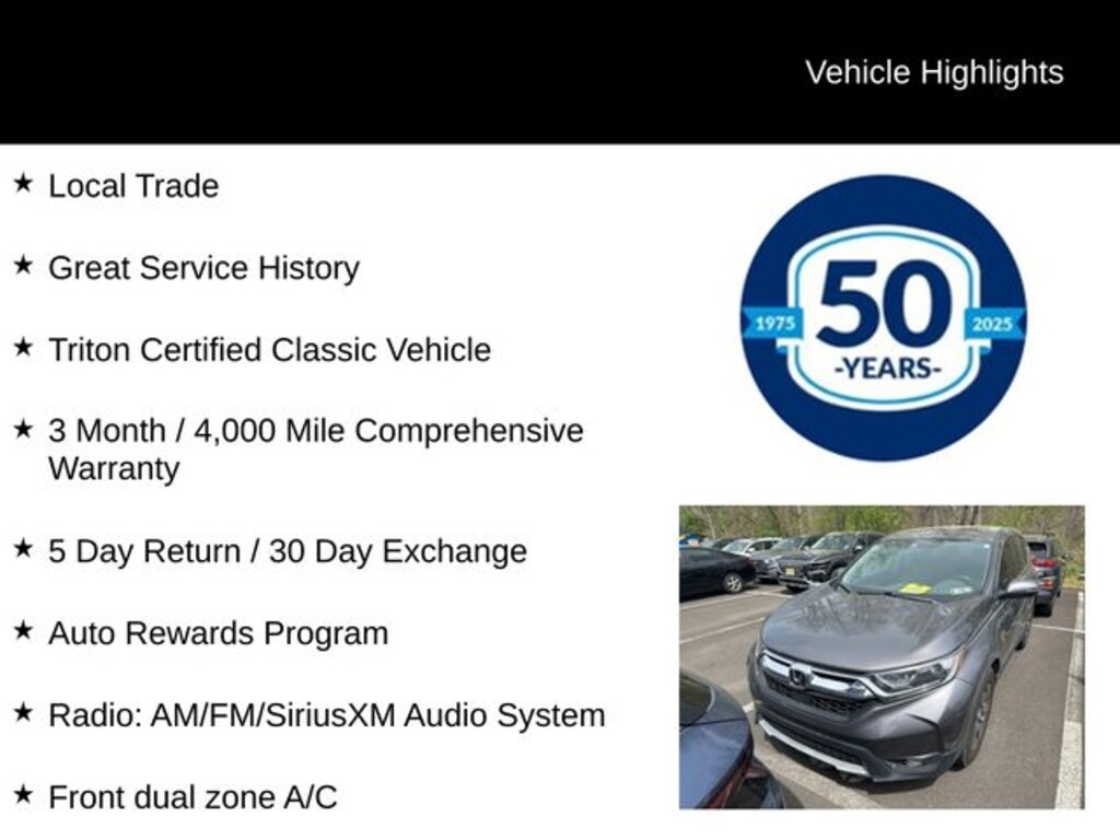 This Honda CR-V has been meticulously maintained and is proudly offered as a Triton Certified Classic Vehicle. With our rigorous inspection process and comprehensive warranty, you can drive with confidence knowing that this SUV has been thoroughly vetted and is ready to provide you with years of reliable service.