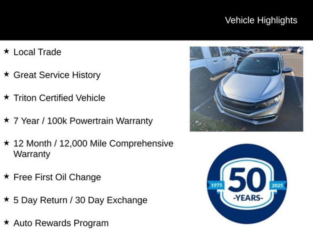 Recent Arrival! 2020 Honda Civic LX LX 2.0L I4 DOHC 16V i-VTEC 6-Speed Manual FWD 4D Sedan Silver Local Trade, Great Service History, Triton Certified Vehicle, 7 Year / 100k Powertrain Warranty, 12 Month / 12,000 Mile Comprehensive Warranty, Free First Oil Change, 5 Day Return / 30 Day Exchange, Auto Rewards Program, Black Cloth, Auto High-beam Headlights, Automatic temperature control, Cloth Seat Trim, Exterior Parking Camera Rear, Forward collision: Collision Mitigation Braking System (CMBS) + FCW mitigation, Front Bucket Seats, Illuminated entry, Lane departure: Lane Keeping Assist System (LKAS) active, Power door mirrors, Radio: 160-Watt AM/FM Audio System, Steering wheel mounted audio controls.