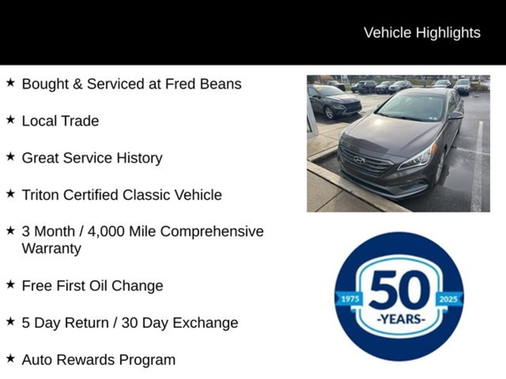 Recent Arrival! 2015 Hyundai Sonata Sport Sport 2.4L I4 DGI DOHC 16V PZEV 185hp 6-Speed Automatic with Shiftronic FWD 4D Sedan Dark Truffle Bought & Serviced at Fred Beans, Local Trade, Great Service History, Triton Certified Classic Vehicle, 3 Month / 4,000 Mile Comprehensive Warranty, Free First Oil Change, 5 Day Return / 30 Day Exchange, Auto Rewards Program, Beige Cloth, Exterior Parking Camera Rear, Fully automatic headlights, Heated door mirrors, Heated front seats, Illuminated entry, Power door mirrors, Power driver seat, Premium Cloth Seating Surfaces, Radio: AM/FM/SiriusXM/CD/MP3 Audio System, Steering wheel mounted audio controls, Turn signal indicator mirrors, Wheels: 17 x 7.0J Aluminum Alloy.