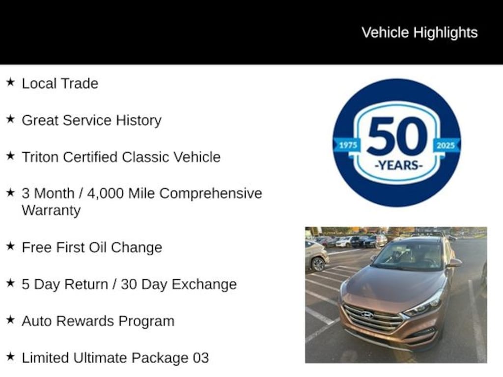 Recent Arrival! 2016 Hyundai Tucson Limited Limited 1.6L I4 DGI Turbocharged DOHC 16V ULEV II 175hp 7-Speed Automatic AWD 4D Sport Utility Mojave Sand Local Trade, Great Service History, Triton Certified Classic Vehicle, 3 Month / 4,000 Mile Comprehensive Warranty, Free First Oil Change, 5 Day Return / 30 Day Exchange, Auto Rewards Program, AWD, Auto-dimming Rear-View mirror, Backup Warning Sensors, Exterior Parking Camera Rear, Front dual zone A/C, Heated door mirrors, Heated front seats, Heated Rear Seats, High-Intensity Discharge Headlights, Illuminated entry, Lane Departure Warning System (LDWS), Leather Seat Trim, Leather Shift Knob, Limited Ultimate Package 03, Panoramic Sunroof, Power door mirrors, Power driver seat, Power Liftgate, Power passenger seat, Radio: Autonet AM/FM/HD Radio/MP3 Audio System, Remote keyless entry, Steering wheel mounted audio controls, Turn signal indicator mirrors, Ventilated Front Bucket Seats, Wheels: 19 x 7.5J Alloys.