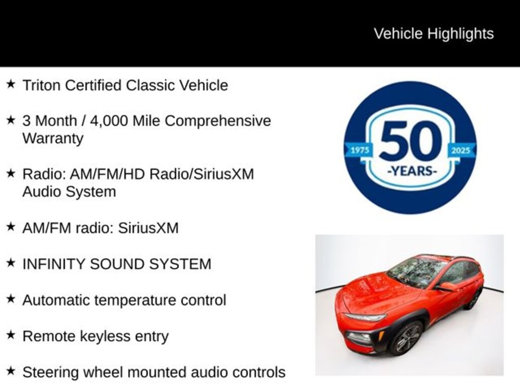 ***One Owner Clean Carfax*** Recent Arrival! 2019 Hyundai Kona Limited 1.6L I4 DGI 7-Speed Automatic AWD 4D Sport Utility Sunset Orange Triton Certified Classic Vehicle, 3 Month / 4,000 Mile Comprehensive Warranty, 8-Way Power Driver Seat, AM/FM radio: SiriusXM, Apple CarPlay & Android Auto, Auto-dimming Rear-View mirror, Automatic temperature control, Exterior Parking Camera Rear, Fully automatic headlights, Garage door transmitter: HomeLink, Heated door mirrors, Heated Front Bucket Seats, Heated front seats, INFINITY SOUND SYSTEM, Leather Seat Trim, Power door mirrors, Power driver seat, Power moonroof, Radio: AM/FM/HD Radio/SiriusXM Audio System, Remote keyless entry, Steering wheel mounted audio controls, Turn signal indicator mirrors.