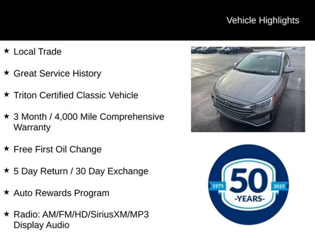 Recent Arrival! 2020 Hyundai Elantra Value Edition Value Edition 2.0L 4-Cylinder DOHC 16V CVT FWD 4D Sedan Fluid Metal Local Trade, Great Service History, Triton Certified Classic Vehicle, 3 Month / 4,000 Mile Comprehensive Warranty, Free First Oil Change, 5 Day Return / 30 Day Exchange, Auto Rewards Program, Alloy wheels, Apple CarPlay & Android Auto, Exterior Parking Camera Rear, Front dual zone A/C, Fully automatic headlights, Heated door mirrors, Heated front seats, Illuminated entry, Power door mirrors, Power moonroof, Radio: AM/FM/HD/SiriusXM/MP3 Display Audio, Remote keyless entry, Steering wheel mounted audio controls.