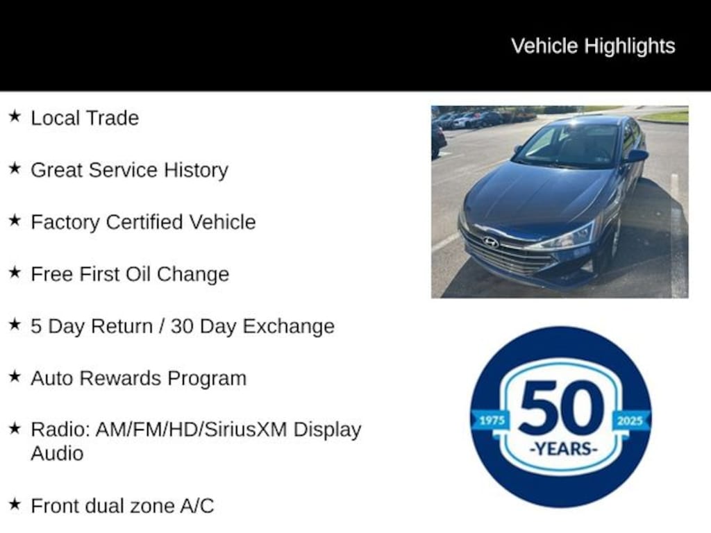 Recent Arrival! 2020 Hyundai Elantra SEL SEL 2.0L 4-Cylinder DOHC 16V CVT FWD 4D Sedan Lakeside Blue Local Trade, Great Service History, Factory Certified Vehicle, Free First Oil Change, 5 Day Return / 30 Day Exchange, Auto Rewards Program, Alloy wheels, Apple CarPlay & Android Auto, Exterior Parking Camera Rear, Front Bucket Seats, Front dual zone A/C, Fully automatic headlights, Heated door mirrors, Illuminated entry, Power door mirrors, Radio: AM/FM/HD/SiriusXM Display Audio, Remote keyless entry, Steering wheel mounted audio controls.
