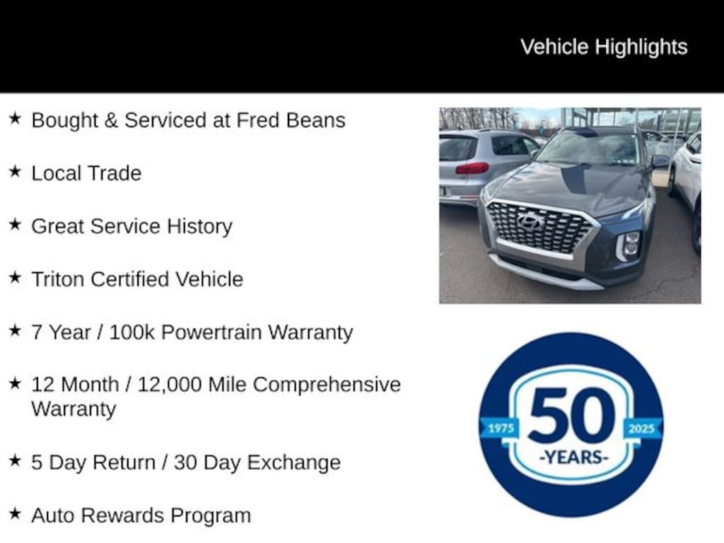 This Palisade is a Triton Certified vehicle, meaning it has undergone a rigorous inspection and comes with a comprehensive warranty to give you peace of mind. With its 7 Year / 100k Powertrain Warranty and 12 Month / 12,000 Mile Comprehensive Warranty, you can rest assured that your investment is well-protected.