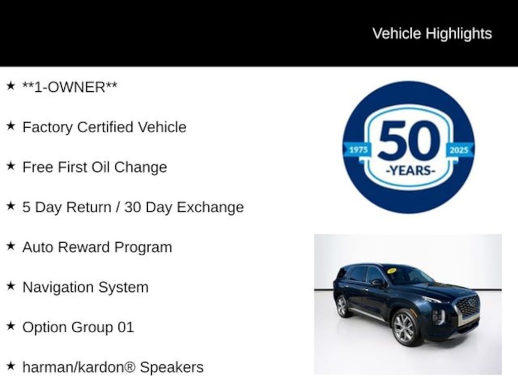 **1-OWNER**, Factory Certified Vehicle, Free First Oil Change, 5 Day Return / 30 Day Exchange, Auto Reward Program, 3rd row seats: split-bench, Apple CarPlay & Android Auto, Front dual zone A/C, harman/kardon® Speakers, Heads-Up Display, Heated & Ventilated Front Bucket Seats, Memory seat, Navigation System, Option Group 01, Power Liftgate, Power moonroof, Premium Nappa Leather Seat Trim, 12 Speakers, 3.648 Axle Ratio, 4-Wheel Disc Brakes, ABS brakes, Air Conditioning, Alloy wheels, AM/FM radio: SiriusXM, Auto High-beam Headlights, Auto-dimming Rear-View mirror, Auto-leveling suspension, Automatic temperature control, Brake assist, Bumper Applique, Bumpers: body-color, Cargo Cover/Screen, Cargo Net, Carpeted Floor Mats, Compass, Delay-off headlights, Driver door bin, Driver vanity mirror, Dual front impact airbags, Dual front side impact airbags, Electronic Stability Control, Emergency communication system: Blue Link Connected Car Service (3-year complimentary subscription), First Aid Kit, Four wheel independent suspension, Front anti-roll bar, Front Bucket Seats, Front Center Armrest, Front reading lights, Fully automatic headlights, Garage door transmitter: HomeLink, Heated door mirrors, Heated front seats, Heated rear seats, Heated steering wheel, Illuminated entry, Knee airbag, Low tire pressure warning, Mudguards, Occupant sensing airbag, Outside temperature display, Overhead airbag, Overhead console, Panic alarm, Passenger door bin, Passenger vanity mirror, Power door mirrors, Power driver seat, Power passenger seat, Power steering, Power windows, Radio data system, Radio: AM/FM/MP3 Premium Audio System, Rain sensing wipers, Rear air conditioning, Rear anti-roll bar, Rear reading lights, Rear window defroster, Rear window wiper, Reclining 3rd row seat, Remote keyless entry, Security system, Speed control, Speed-sensing steering, Split folding rear seat, Spoiler, Steering wheel mounted audio controls, Tachometer, Telescoping steering wheel, Tilt steering wheel, Traction control, Trip computer, Turn signal indicator mirrors, Variably intermittent wipers, Ventilated front seats, Ventilated rear seats, Wheel Locks, Wheels: 20" x 7.5J Split 5-Spoke Machined Alloy, 3rd row seats: split-bench, Apple CarPlay & Android Auto, Front dual zone A/C, harman/kardon® Speakers, Heads-Up Display, Heated & Ventilated Front Bucket Seats, Memory seat, Navigation System, Option Group 01, Power Liftgate, Power moonroof, Premium Nappa Leather Seat Trim.