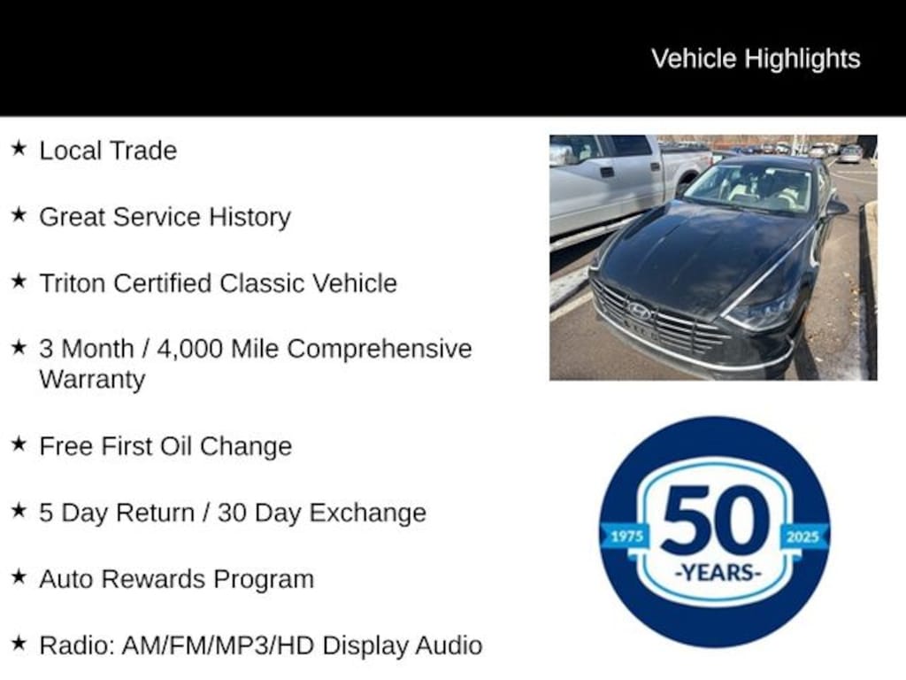Recent Arrival! 2021 Hyundai Sonata SE SE 2.5L I4 8-Speed Automatic with Overdrive FWD 4D Sedan Phantom Black Local Trade, Great Service History, Triton Certified Classic Vehicle, 3 Month / 4,000 Mile Comprehensive Warranty, Free First Oil Change, 5 Day Return / 30 Day Exchange, Auto Rewards Program, Dark Gray Cloth, Alloy wheels, Apple CarPlay & Android Auto, Auto High-beam Headlights, Exterior Parking Camera Rear, Fully automatic headlights, Illuminated entry, Power door mirrors, Premium Cloth Seating Surfaces, Radio: AM/FM/MP3/HD Display Audio, Remote keyless entry, Split folding rear seat, Steering wheel mounted audio controls.