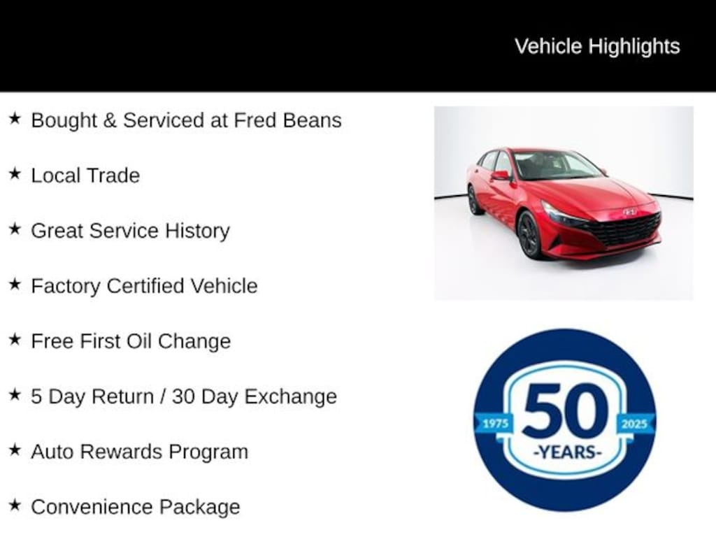 2022 Hyundai Elantra SEL SEL 2.0L 4-Cylinder DOHC 16V CVT FWD 4D Sedan Calypso Red Bought & Serviced at Fred Beans, Local Trade, Great Service History, Factory Certified Vehicle, Free First Oil Change, 5 Day Return / 30 Day Exchange, Auto Rewards Program, 16" x 6.5J Alloy Wheels, 4-Wheel Disc Brakes, ABS brakes, Apple CarPlay & Android Auto, Auto High-beam Headlights, Automatic temperature control, Brake assist, Convenience Package, Dual front impact airbags, Dual front side impact airbags, Electronic Parking Brake, Electronic Stability Control, Exterior Parking Camera Rear, Forward Collision Avoidance Assist, Front dual zone A/C, Full 10.25" LCD TFT Cluster, Heated Front Seats, Heated Outside Mirrors, Leather-Wrapped Steering Wheel, Option Group 02, Radio: AM/FM/HD/SiriusXM Display Audio, Remote keyless entry, Security system, Smart Cruise Control w/Stop & Go, Speed-sensing steering, Steering wheel mounted audio controls, Telescoping steering wheel, Tilt steering wheel, Traction control, Wireless Device Charging.