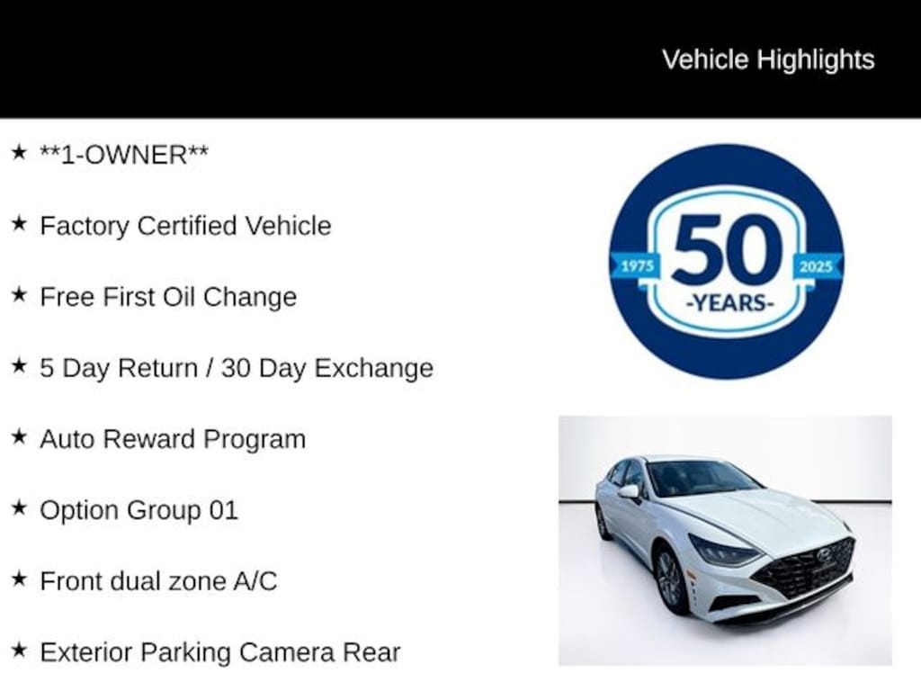 **1-OWNER**, Factory Certified Vehicle, Free First Oil Change, 5 Day Return / 30 Day Exchange, Auto Reward Program, Apple CarPlay & Android Auto, Exterior Parking Camera Rear, Front dual zone A/C, Option Group 01, 17" x 7.0J Aluminum Alloy Wheels, 4-Wheel Disc Brakes, 6 Speakers, ABS brakes, Air Conditioning, Alloy wheels, AM/FM radio: SiriusXM, Auto High-beam Headlights, Automatic temperature control, Brake assist, Bumpers: body-color, Cargo Net, Carpeted Floor Mats, Delay-off headlights, Driver door bin, Driver vanity mirror, Dual front impact airbags, Dual front side impact airbags, Electronic Stability Control, Emergency communication system: Blue Link Connected Car Service (3-year complimentary subscription), Four wheel independent suspension, Front anti-roll bar, Front Bucket Seats, Front Center Armrest, Front reading lights, Fully automatic headlights, Heated door mirrors, Heated Front Bucket Seats, Heated front seats, Illuminated entry, Knee airbag, Low tire pressure warning, Mud Guards, Occupant sensing airbag, Outside temperature display, Overhead airbag, Overhead console, Panic alarm, Passenger door bin, Passenger vanity mirror, Power door mirrors, Power driver seat, Power steering, Power windows, Premium Cloth Seating Surfaces, Radio data system, Radio: AM/FM/MP3/HD/SiriusXM Display Audio, Rear anti-roll bar, Rear Bumper Applique, Rear seat center armrest, Rear side impact airbag, Rear window defroster, Remote keyless entry, Security system, Speed control, Speed-sensing steering, Speed-Sensitive Wipers, Split folding rear seat, Steering wheel mounted audio controls, Tachometer, Telescoping steering wheel, Tilt steering wheel, Traction control, Trip computer, Turn signal indicator mirrors, Variably intermittent wipers, Apple CarPlay & Android Auto, Exterior Parking Camera Rear, Front dual zone A/C, Option Group 01.