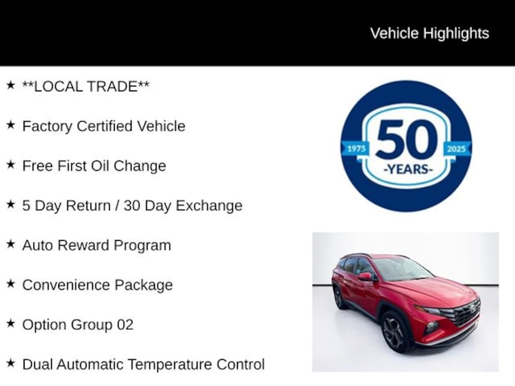 **LOCAL TRADE**, Factory Certified Vehicle, Free First Oil Change, 5 Day Return / 30 Day Exchange, Auto Reward Program, 10.25" Digital Instrument Cluster, Auto-Dimming Interior Mirror w/Homelink, Convenience Package, Digital Key, Dual Automatic Temperature Control, Hands-Free Power Liftgate w/Auto-Open, Leather-Wrapped Shift Knob, Leather-Wrapped Steering Wheel, LED Interior Lights (Room, Map), Option Group 02, Power Sunroof, Ultrasonic Rear Occupant Alert, Wheels: 19" x 7.5J" Machine-Face Finish Alloy, Wireless Phone Charging, 3.648 Axle Ratio, 4-Wheel Disc Brakes, 6 Speakers, ABS brakes, Air Conditioning, Alloy wheels, AM/FM radio: SiriusXM, Apple CarPlay & Android Auto, Auto High-beam Headlights, Brake assist, Bumpers: body-color, Cargo Tray, Carpeted Floor Mats, Delay-off headlights, Driver door bin, Driver vanity mirror, Dual front impact airbags, Dual front side impact airbags, Electronic Stability Control, Emergency communication system: Blue Link Connected Car Service (3-year complimentary subscription), Four wheel independent suspension, Front anti-roll bar, Front Bucket Seats, Front Center Armrest, Front reading lights, Fully automatic headlights, Heated door mirrors, Heated Front Bucket Seats, Heated front seats, Illuminated entry, Low tire pressure warning, Occupant sensing airbag, Outside temperature display, Overhead airbag, Overhead console, Panic alarm, Passenger door bin, Passenger vanity mirror, Power door mirrors, Power driver seat, Power steering, Power windows, Radio data system, Radio: AM/FM/HD/SiriusXM Audio System, Rear anti-roll bar, Rear seat center armrest, Rear window defroster, Rear window wiper, Remote keyless entry, Roof rack: rails only, Security system, Speed control, Split folding rear seat, Spoiler, Stain & Odor Resistant Cloth Seat Trim, Steering wheel mounted audio controls, Tachometer, Telescoping steering wheel, Tilt steering wheel, Tow Hitch, Traction control, Trip computer, Turn signal indicator mirrors, Variably intermittent wipers, Wheels: 17" x 7.0J" Alloy, 10.25" Digital Instrument Cluster, Auto-Dimming Interior Mirror w/Homelink, Convenience Package, Digital Key, Dual Automatic Temperature Control, Hands-Free Power Liftgate w/Auto-Open, Leather-Wrapped Shift Knob, Leather-Wrapped Steering Wheel, LED Interior Lights (Room, Map), Option Group 02, Power Sunroof, Ultrasonic Rear Occupant Alert, Wheels: 19" x 7.5J" Machine-Face Finish Alloy, Wireless Phone Charging.