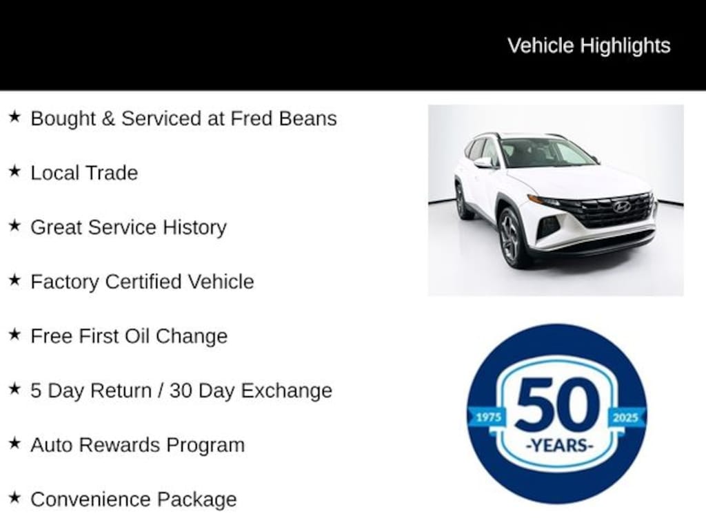 2022 Hyundai Tucson SEL SEL 2.5L I4 DGI DOHC 16V LEV3-ULEV70 187hp 8-Speed Automatic with SHIFTRONIC AWD 4D Sport Utility Quartz White Bought & Serviced at Fred Beans, Local Trade, Great Service History, Factory Certified Vehicle, Free First Oil Change, 5 Day Return / 30 Day Exchange, Auto Rewards Program, AWD, 10.25" Digital Instrument Cluster, Air Conditioning, Apple CarPlay & Android Auto, Auto High-beam Headlights, Auto-Dimming Interior Mirror w/Homelink, Convenience Package, Dual Automatic Temperature Control, Heated door mirrors, Heated Front Bucket Seats, Option Group 02, Power driver seat, Power Sunroof, Radio: AM/FM/HD/SiriusXM Audio System, Remote keyless entry, Security system, Speed control, Split folding rear seat, Stain & Odor Resistant Cloth Seat Trim, Steering wheel mounted audio controls, Tilt steering wheel, Turn signal indicator mirrors, Ultrasonic Rear Occupant Alert, Wheels: 19" x 7.5J" Machine-Face Finish Alloy, Wireless Phone Charging.