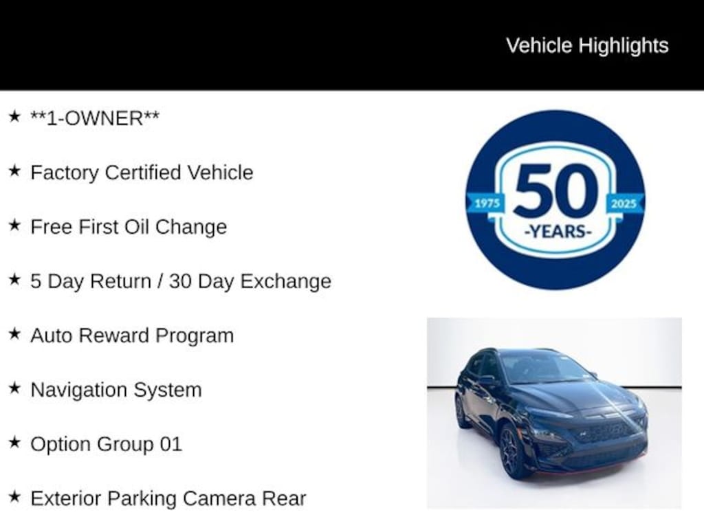 **1-OWNER**, Factory Certified Vehicle, Free First Oil Change, 5 Day Return / 30 Day Exchange, Auto Reward Program, Apple CarPlay & Android Auto, Exterior Parking Camera Rear, Navigation System, Option Group 01, 2.810 Axle Ratio, 4-Wheel Disc Brakes, 8 Speakers, ABS brakes, Air Conditioning, Alloy wheels, AM/FM radio: SiriusXM, Auto High-beam Headlights, Automatic temperature control, Brake assist, Bumpers: body-color, Cargo Net, Cargo Tray, Delay-off headlights, Driver door bin, Driver vanity mirror, Dual front impact airbags, Dual front side impact airbags, Electronic Stability Control, Emergency communication system: Blue Link Connected Car Service (3-year complimentary subscription), Four wheel independent suspension, Front anti-roll bar, Front Bucket Seats, Front Center Armrest w/Storage, Front reading lights, Fully automatic headlights, harman/kardon® Speakers, Heated door mirrors, Heated front seats, Heated N Sport Seats, Illuminated entry, Leather Shift Knob, Leather steering wheel, Leather/Suede Seat Trim, Low tire pressure warning, Occupant sensing airbag, Outside temperature display, Overhead airbag, Overhead console, Panic alarm, Passenger door bin, Passenger vanity mirror, Power door mirrors, Power driver seat, Power steering, Power windows, Radio data system, Radio: AM/FM/SiriusXM/HD Audio System, Rear anti-roll bar, Rear seat center armrest, Rear window defroster, Rear window wiper, Remote keyless entry, Roof Rack Cross Rails, Security system, Speed control, Speed-sensing steering, Split folding rear seat, Spoiler, Sport steering wheel, Steering wheel mounted audio controls, Tachometer, Telescoping steering wheel, Tilt steering wheel, Traction control, Trip computer, Turn signal indicator mirrors, Variably intermittent wipers, Wheels: 19" x 8.0J Alloy, Apple CarPlay & Android Auto, Exterior Parking Camera Rear, Navigation System, Option Group 01.