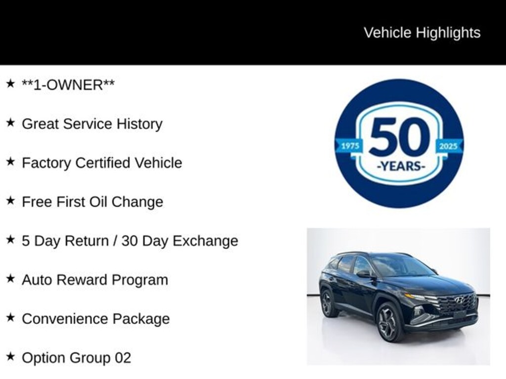 **1-OWNER**, Great Service History, Factory Certified Vehicle, Free First Oil Change, 5 Day Return / 30 Day Exchange, Auto Reward Program, 10.25" Digital Instrument Cluster, Apple CarPlay & Android Auto, Auto-Dimming Interior Mirror w/Homelink, Convenience Package, Dual Automatic Temperature Control, H-Tex Seat Trim, Leather-Wrapped Shift Knob, Leather-Wrapped Steering Wheel, LED Interior Lights (Room, Map), Option Group 02, Power Liftgate, Power Sunroof, Ultrasonic Rear Occupant Alert, Wheels: 19" x 7.5J" Machine-Face Finish Alloy, 3.648 Axle Ratio, 4-Wheel Disc Brakes, 6 Speakers, ABS brakes, Air Conditioning, Alloy wheels, AM/FM radio: SiriusXM, Auto High-beam Headlights, Brake assist, Bumpers: body-color, Cargo Cover, Cargo Tray, Carpeted Floor Mats, Delay-off headlights, Driver door bin, Driver vanity mirror, Dual front impact airbags, Dual front side impact airbags, Electronic Stability Control, Emergency communication system: Blue Link Connected Car Service (3-year complimentary subscription), Four wheel independent suspension, Front and Rear Mudguards, Front anti-roll bar, Front Bucket Seats, Front Center Armrest, Front reading lights, Fully automatic headlights, Heated door mirrors, Heated Front Bucket Seats, Heated front seats, Illuminated entry, Low tire pressure warning, Occupant sensing airbag, Outside temperature display, Overhead airbag, Overhead console, Panic alarm, Passenger door bin, Passenger vanity mirror, Power door mirrors, Power driver seat, Power steering, Power windows, Radio data system, Radio: AM/FM/HD/SiriusXM Audio System, Rear anti-roll bar, Rear seat center armrest, Rear window defroster, Rear window wiper, Remote keyless entry, Roof rack: rails only, Security system, Speed control, Split folding rear seat, Spoiler, Stain & Odor Resistant Cloth Seat Trim, Steering wheel mounted audio controls, Tachometer, Telescoping steering wheel, Tilt steering wheel, Traction control, Trip computer, Turn signal indicator mirrors, Variably intermittent wipers, Wheels: 17" x 7.0J" Alloy, 10.25" Digital Instrument Cluster, Apple CarPlay & Android Auto, Auto-Dimming Interior Mirror w/Homelink, Convenience Package, Dual Automatic Temperature Control, H-Tex Seat Trim, Leather-Wrapped Shift Knob, Leather-Wrapped Steering Wheel, LED Interior Lights (Room, Map), Option Group 02, Power Liftgate, Power Sunroof, Ultrasonic Rear Occupant Alert, Wheels: 19" x 7.5J" Machine-Face Finish Alloy.