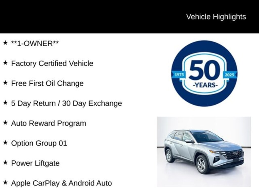 **1-OWNER**, Factory Certified Vehicle, Free First Oil Change, 5 Day Return / 30 Day Exchange, Auto Reward Program, Apple CarPlay & Android Auto, Option Group 01, Power Liftgate, 3.648 Axle Ratio, 4-Wheel Disc Brakes, 6 Speakers, ABS brakes, Air Conditioning, Alloy wheels, AM/FM radio: SiriusXM, Auto High-beam Headlights, Brake assist, Bumpers: body-color, Cargo Cover, Cargo Tray, Carpeted Floor Mats, Delay-off headlights, Driver door bin, Driver vanity mirror, Dual front impact airbags, Dual front side impact airbags, Electronic Stability Control, Emergency communication system: Blue Link Connected Car Service (3-year complimentary subscription), First Aid Kit, Four wheel independent suspension, Front and Rear Mudguards, Front anti-roll bar, Front Bucket Seats, Front Center Armrest, Front reading lights, Fully automatic headlights, H-Tex Seat Trim, Heated door mirrors, Heated Front Bucket Seats, Heated front seats, Illuminated entry, Low tire pressure warning, Occupant sensing airbag, Outside temperature display, Overhead airbag, Overhead console, Panic alarm, Passenger door bin, Passenger vanity mirror, Power door mirrors, Power driver seat, Power steering, Power windows, Radio data system, Radio: AM/FM/HD/SiriusXM Audio System, Rear anti-roll bar, Rear seat center armrest, Rear window defroster, Rear window wiper, Remote keyless entry, Roof rack: rails only, Security system, Speed control, Split folding rear seat, Spoiler, Stain & Odor Resistant Cloth Seat Trim, Steering wheel mounted audio controls, Tachometer, Telescoping steering wheel, Tilt steering wheel, Traction control, Trip computer, Turn signal indicator mirrors, Variably intermittent wipers, Wheels: 17" x 7.0J" Alloy, Apple CarPlay & Android Auto, Option Group 01, Power Liftgate.