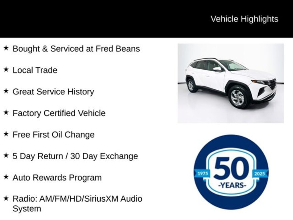 2023 Hyundai Tucson SEL SEL 2.5L I4 DGI DOHC 16V LEV3-ULEV70 187hp 8-Speed Automatic with SHIFTRONIC AWD 4D Sport Utility Serenity White Pearl Bought & Serviced at Fred Beans, Local Trade, Great Service History, Factory Certified Vehicle, Free First Oil Change, 5 Day Return / 30 Day Exchange, Auto Rewards Program, AWD, 4-Wheel Disc Brakes, ABS brakes, Apple CarPlay & Android Auto, Brake assist, Electronic Stability Control, Fully automatic headlights, Heated door mirrors, Heated Front Bucket Seats, Power driver seat, Power Liftgate, Radio: AM/FM/HD/SiriusXM Audio System, Remote keyless entry, Security system, Split folding rear seat, Stain & Odor Resistant Cloth Seat Trim, Steering wheel mounted audio controls, Telescoping steering wheel, Tilt steering wheel, Turn signal indicator mirrors, Wheels: 17" x 7.0J" Alloy.