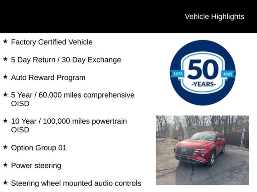As a Hyundai Certified Used Vehicle, this Tucson has undergone a rigorous 173+ point inspection and comes with a comprehensive warranty package, providing you with the peace of mind you deserve. Enjoy the benefits of a 60-month/60,000-mile limited warranty, a 120-month/100,000-mile powertrain limited warranty, and 10-year/unlimited mileage roadside assistance with rental car and trip interruption reimbursement.