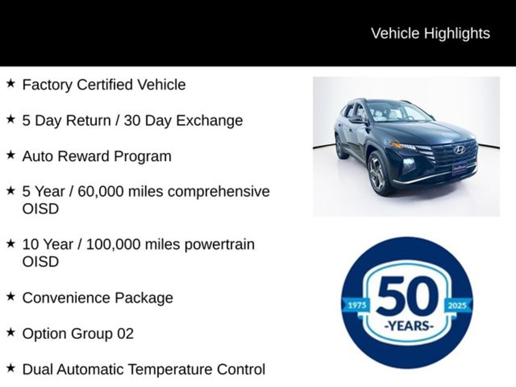 The Tucson's striking Black exterior and well-appointed interior create a premium, sophisticated look and feel. Indulge in the comfort of the heated front bucket seats, the convenience of the 10.25" digital instrument cluster, and the seamless connectivity of Apple CarPlay and Android Auto. The Dual Automatic Temperature Control and Power Sunroof further enhance your driving pleasure.