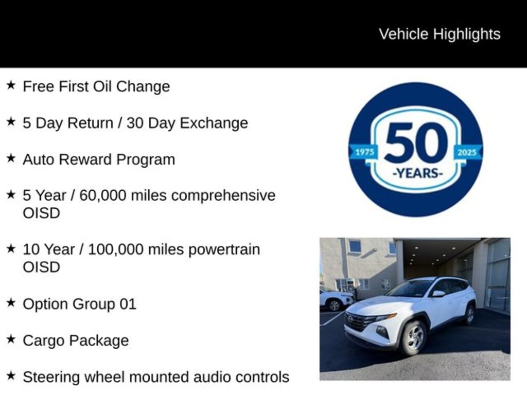 Recent Arrival! 2023 Hyundai Tucson SEL 2.5L I4 DGI DOHC 16V LEV3-ULEV70 187hp 8-Speed Automatic with SHIFTRONIC AWD 4D Sport Utility Serenity White Pearl Free First Oil Change, 5 Day Return / 30 Day Exchange, Auto Reward Program, 5 Year / 60,000 miles comprehensive OISD, 10 Year / 100,000 miles powertrain OISD, AWD, ABS brakes, Apple CarPlay & Android Auto, Cargo Net, Cargo Package, Cargo Tray, Emergency communication system: Blue Link Connected Car Service (3-year complimentary subscription), First Aid Kit, H-Tex Seat Trim, Heated door mirrors, Heated Front Bucket Seats, Option Group 01, Power driver seat, Power Liftgate, Power steering, Power windows, Rear anti-roll bar, Remote keyless entry, Steering wheel mounted audio controls.