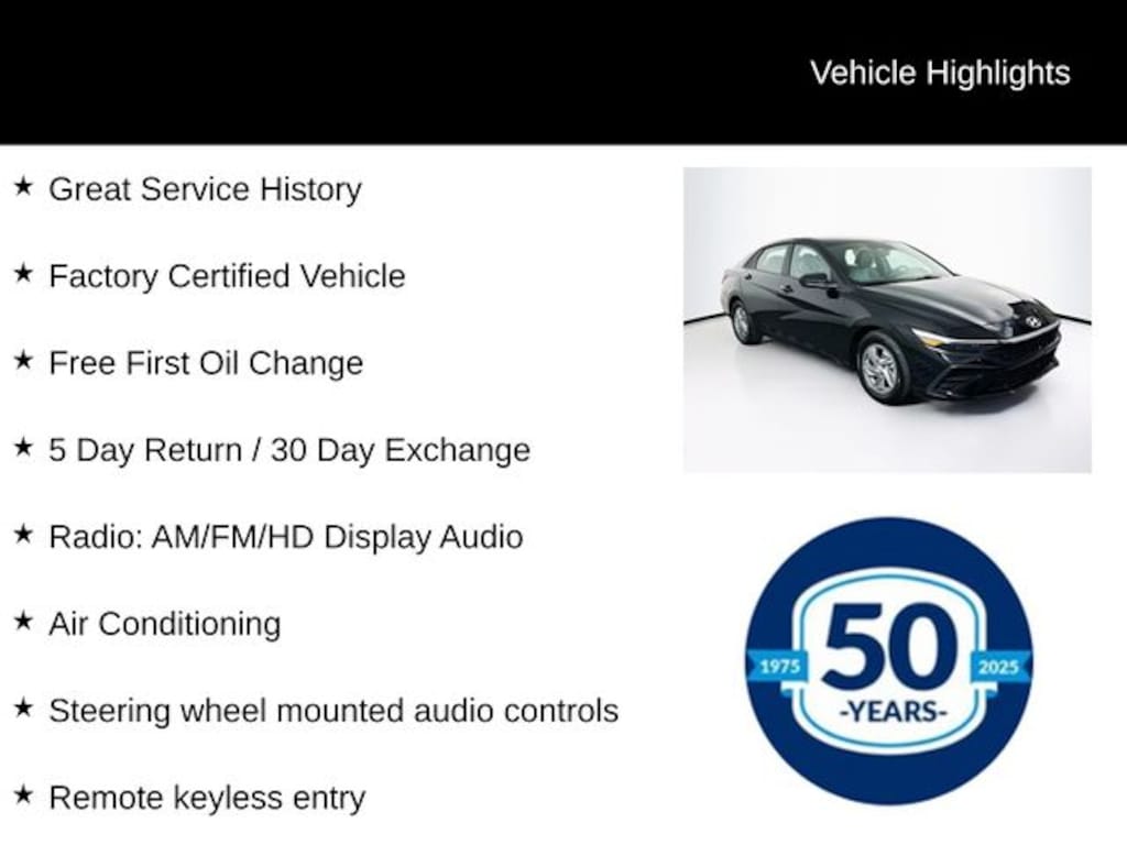 2024 Hyundai Elantra SE SE I4 CVT FWD 4D Sedan Abyss Black Great Service History, Factory Certified Vehicle, Free First Oil Change, 5 Day Return / 30 Day Exchange, 15" x 6.0J Alloy Wheels, 4-Wheel Disc Brakes, ABS brakes, Air Conditioning, Apple CarPlay & Android Auto, Brake assist, Electronic Stability Control, Exterior Parking Camera Rear, Front Bucket Seats, Fully automatic headlights, Illuminated entry, Power door mirrors, Radio: AM/FM/HD Display Audio, Remote keyless entry, Security system, Speed-sensing steering, Steering wheel mounted audio controls, Telescoping steering wheel, Tilt steering wheel.