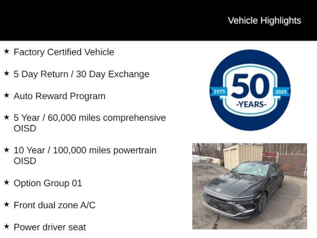 Hyundai has backed this Sonata Hybrid with an impressive Certified Pre-Owned program, providing you with the peace of mind you deserve. This vehicle has undergone a rigorous 173+ point inspection, comes with a 60-month/60,000-mile limited warranty, and a 120-month/100,000-mile powertrain warranty. Additionally, you'll receive 10-year/unlimited mileage roadside assistance, a 10-year/100,000-mile hybrid battery warranty, and a complimentary 1-year subscription to Hyundai's Connected Care and Remote packages.