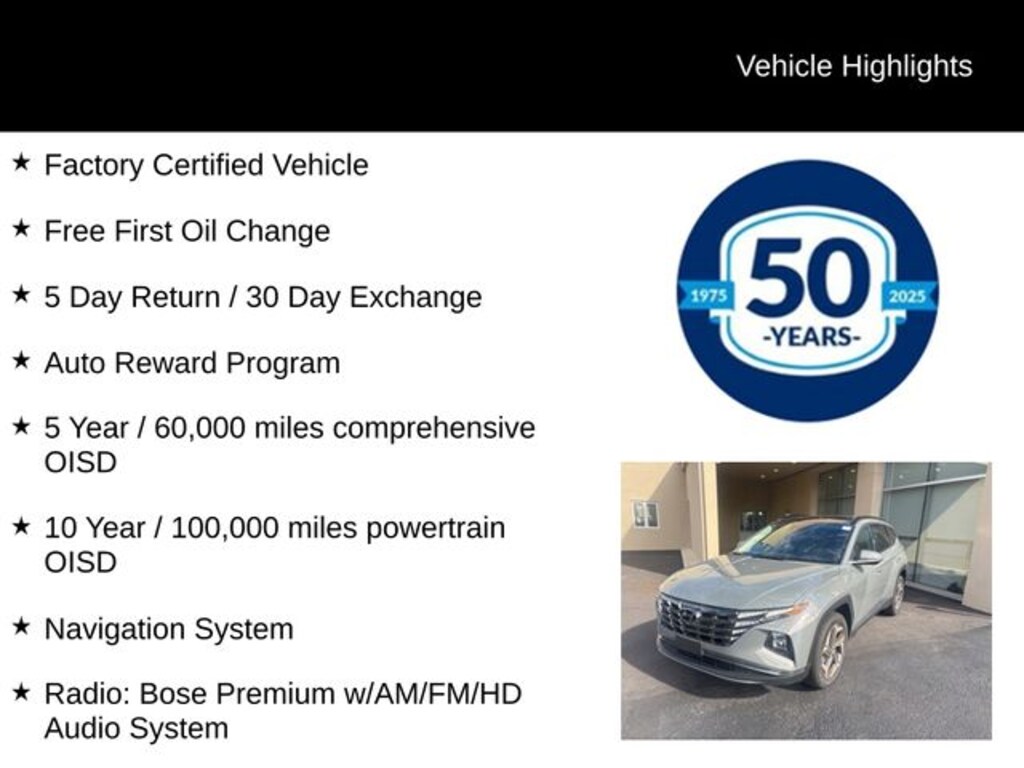Recent Arrival! 2024 Hyundai Tucson Limited 2.5L I4 DGI DOHC 16V LEV3-SULEV30 187hp 8-Speed Automatic with SHIFTRONIC AWD 4D Sport Utility Hampton Gray Factory Certified Vehicle, Free First Oil Change, 5 Day Return / 30 Day Exchange, Auto Reward Program, 5 Year / 60,000 miles comprehensive OISD, 10 Year / 100,000 miles powertrain OISD, AWD, 3.648 Axle Ratio, 8 Speakers, ABS brakes, Apple CarPlay & Android Auto, Automatic temperature control, Brake assist, Dual front side impact airbags, Electronic Stability Control, Emergency communication system: Blue Link Connected Car Service (3-year complimentary subscription), Exterior Parking Camera Rear, Four wheel independent suspension, Front anti-roll bar, Front dual zone A/C, Fully automatic headlights, Garage door transmitter: HomeLink, Heated & Ventilated Front Bucket Seats, Heated door mirrors, Heated rear seats, Heated steering wheel, Leather Seat Trim, Low tire pressure warning, Memory seat, Navigation System, Occupant sensing airbag, Outside temperature display, Overhead airbag, Power door mirrors, Power driver seat, Power Liftgate, Power moonroof, Power passenger seat, Power steering, Power windows, Radio data system, Radio: Bose Premium w/AM/FM/HD Audio System, Rain sensing wipers, Rear anti-roll bar, Rear side impact airbag, Rear window defroster, Remote keyless entry, Security system, Speed control, Split folding rear seat, Steering wheel mounted audio controls, Telescoping steering wheel, Tilt steering wheel, Traction control, Turn signal indicator mirrors, Wheels: 19" x 7.5J" Machine-Face Finish Alloy.