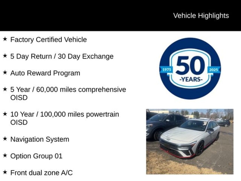 Whether you're seeking a thrilling daily driver or a versatile weekend warrior, the 2025 Hyundai Elantra N Base is the perfect choice. Experience the power and refinement of this Certified Pre-Owned vehicle for yourself by scheduling a test drive at our showroom. We're confident you'll be impressed by its exceptional value and driving dynamics.