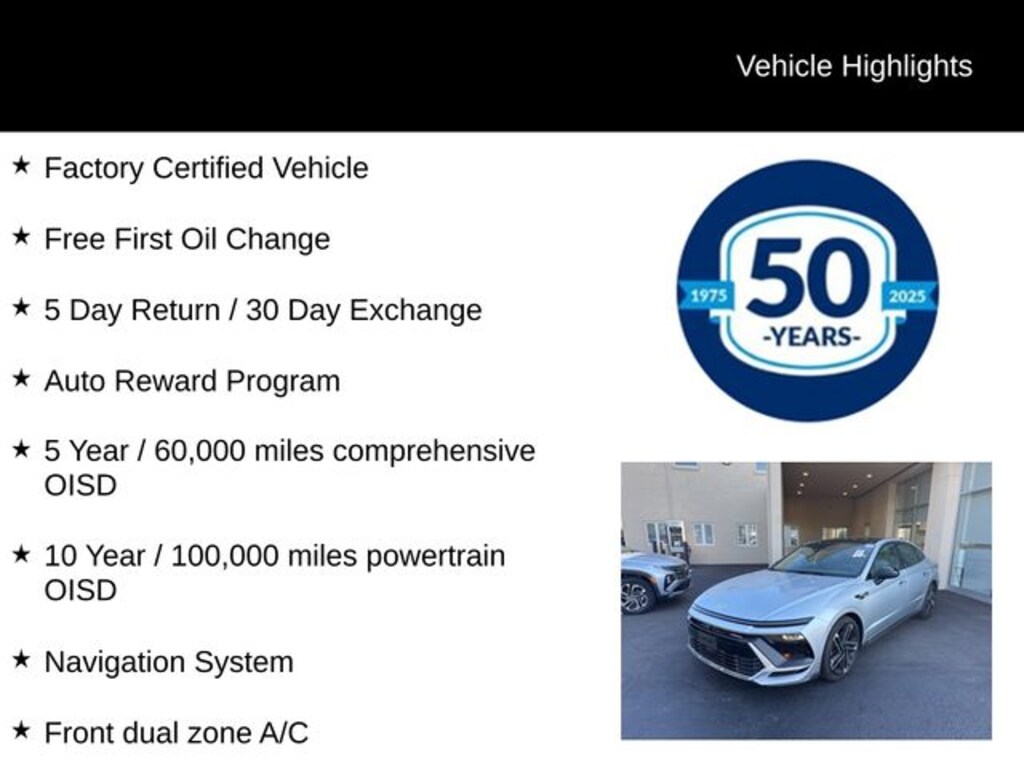 Recent Arrival! 2025 Hyundai Sonata N Line I4 8-Speed FWD 4D Sedan Aero Silver Factory Certified Vehicle, Free First Oil Change, 5 Day Return / 30 Day Exchange, Auto Reward Program, 5 Year / 60,000 miles comprehensive OISD, 10 Year / 100,000 miles powertrain OISD, Dark Grey Premium Synthetic, ABS brakes, Apple CarPlay & Android Auto, Front dual zone A/C, Heated front seats, Navigation System, Power driver seat, Power moonroof, Power steering, Power windows, Remote keyless entry, Steering wheel mounted audio controls.